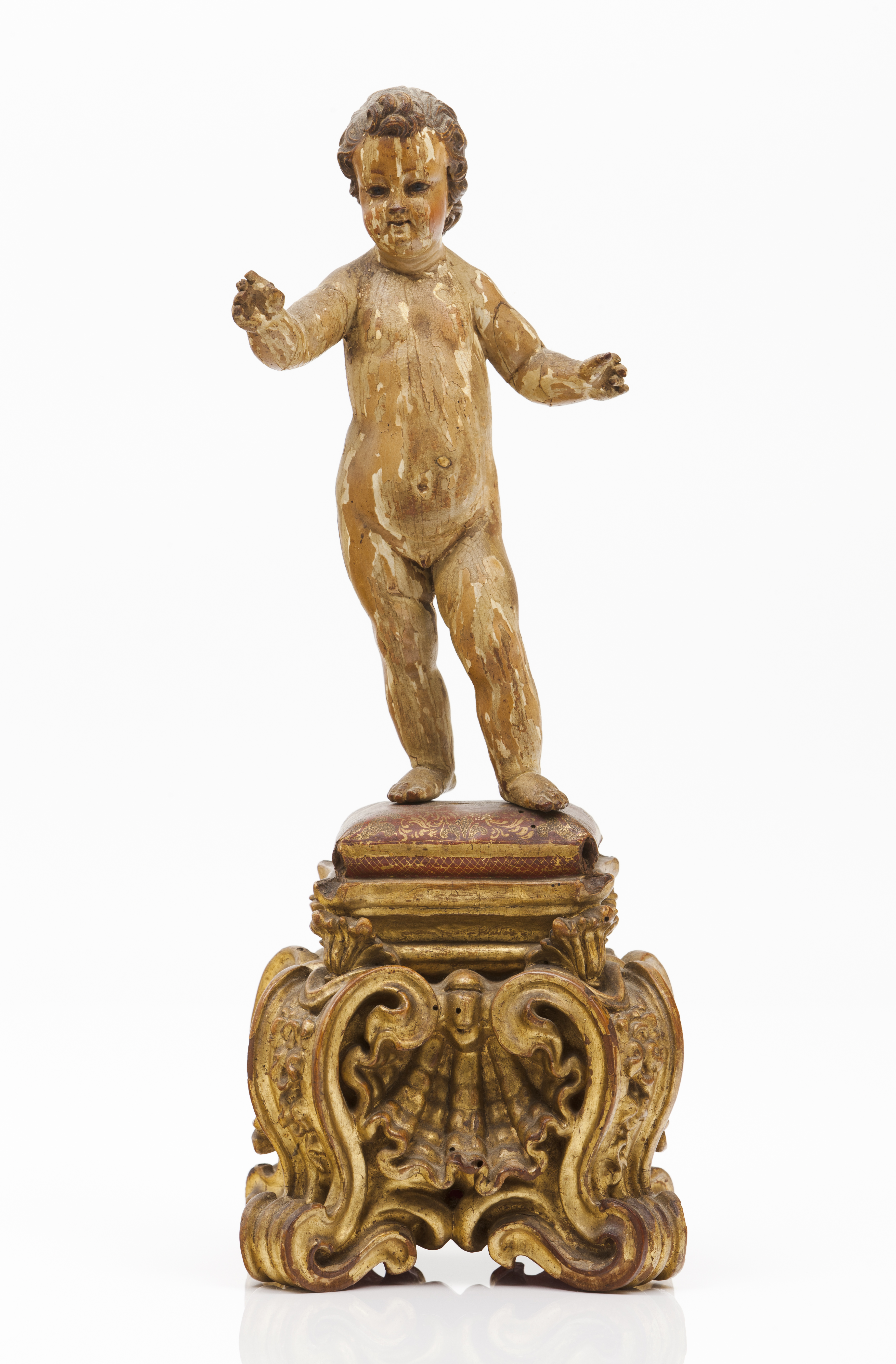 Resting on a cushion of painted and gilt decoration on gilt and carved stand