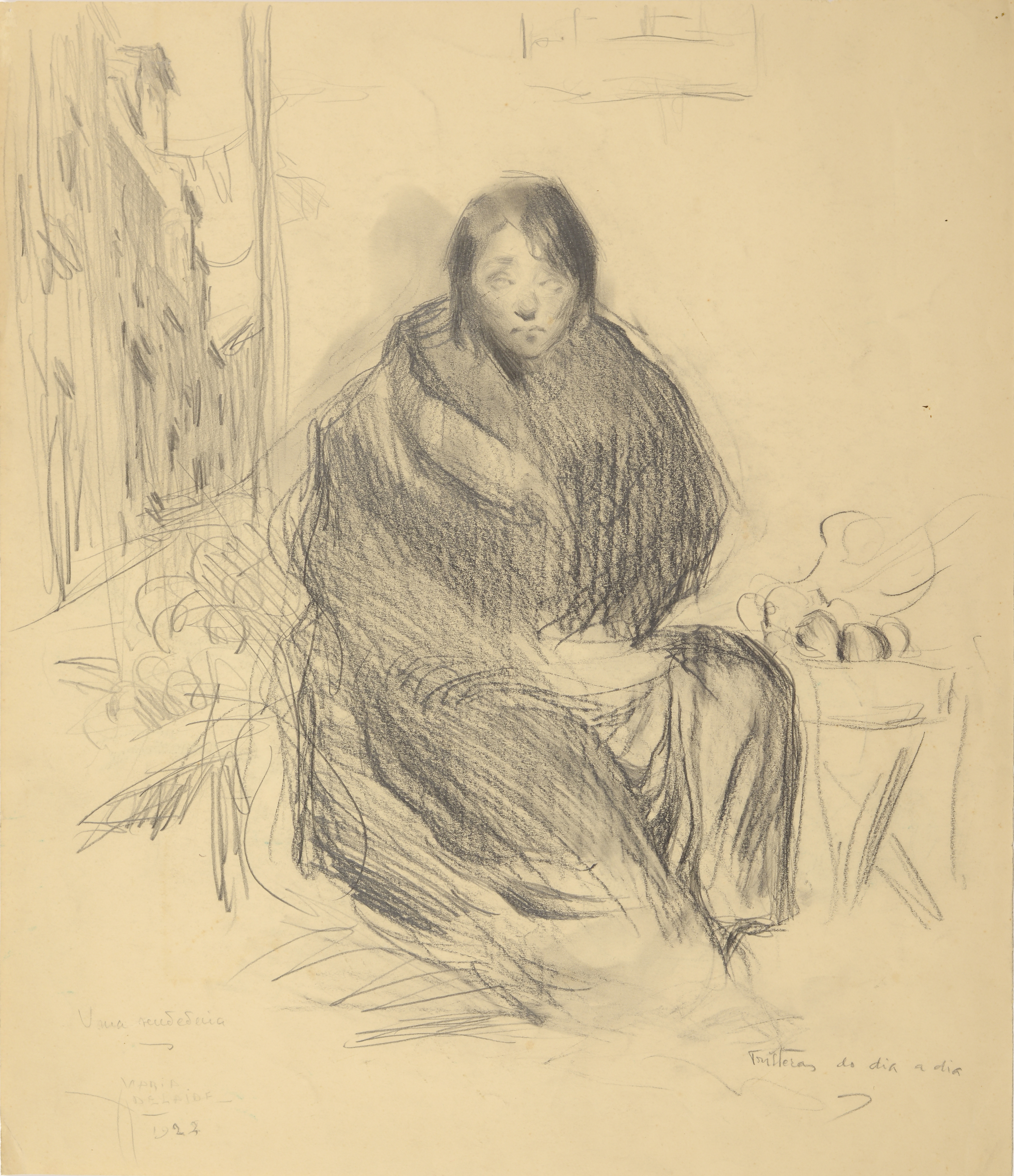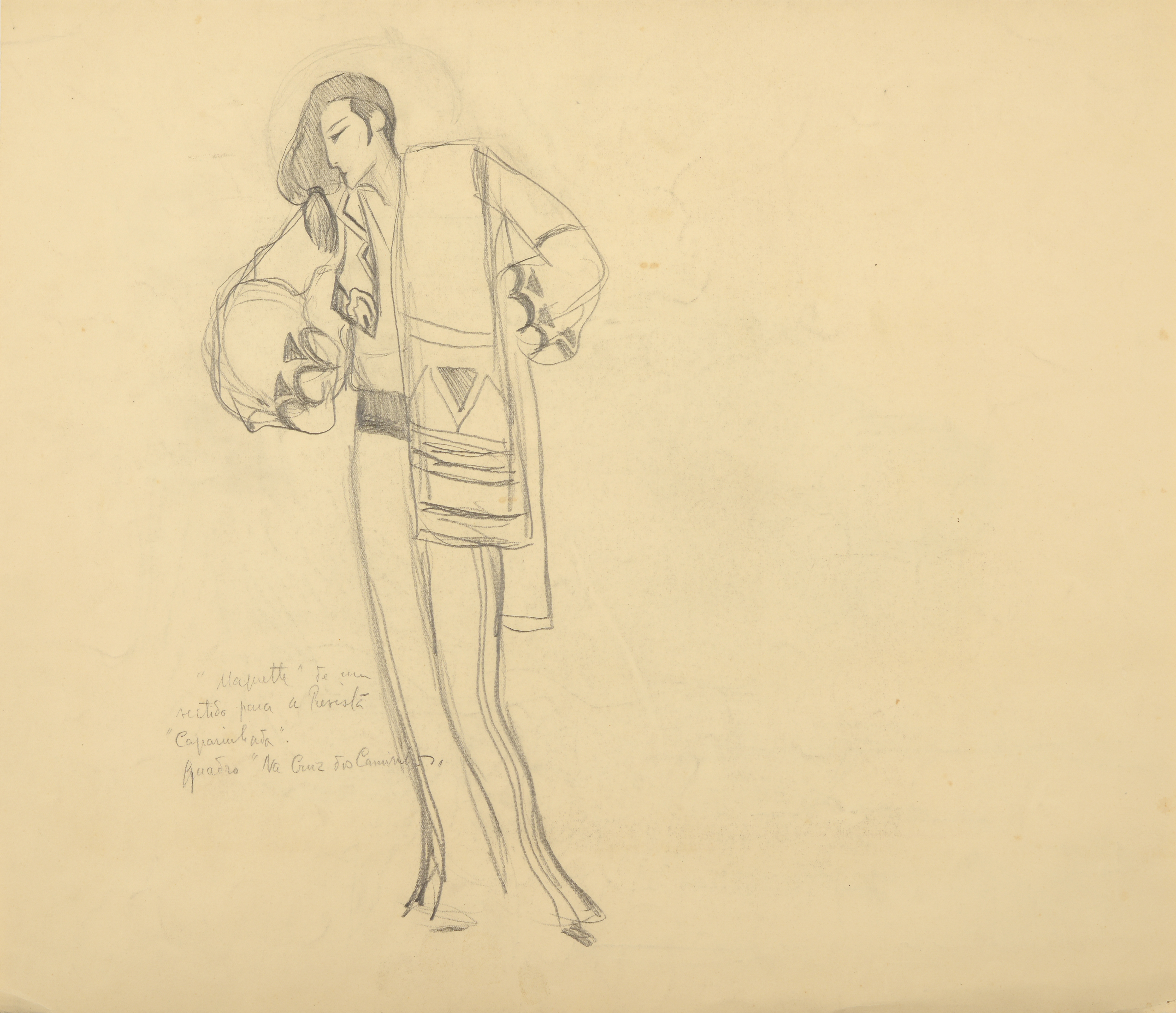 Back with drawing and inscription "maquette de um vestido para a revista Caparinhada. Quadro Na Cruz dos Caminhos"