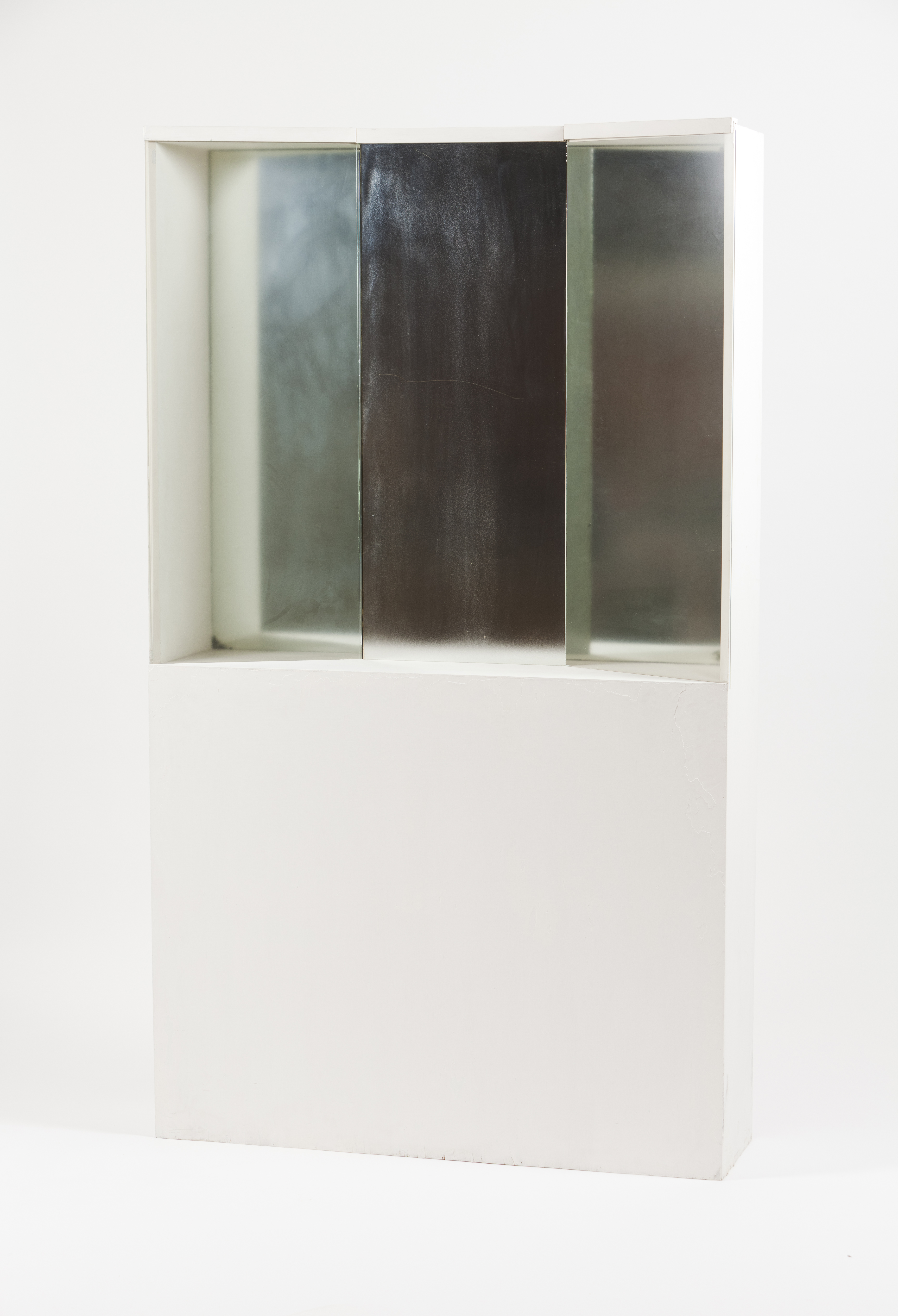 Vinyl tempera on wood, unpolished glass, mirrored unpolished glass and mirrors
