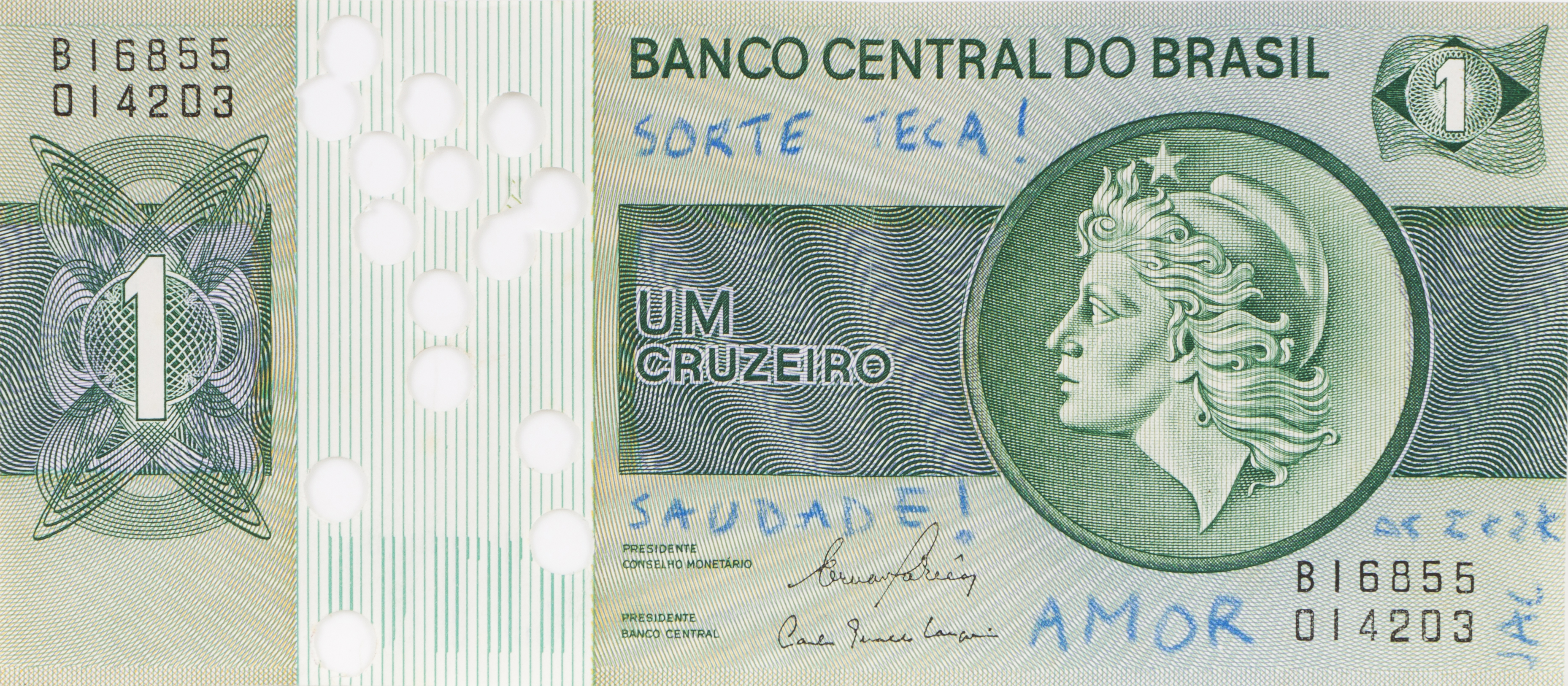 Pencil on cut coin paper (1 cruzeiro)