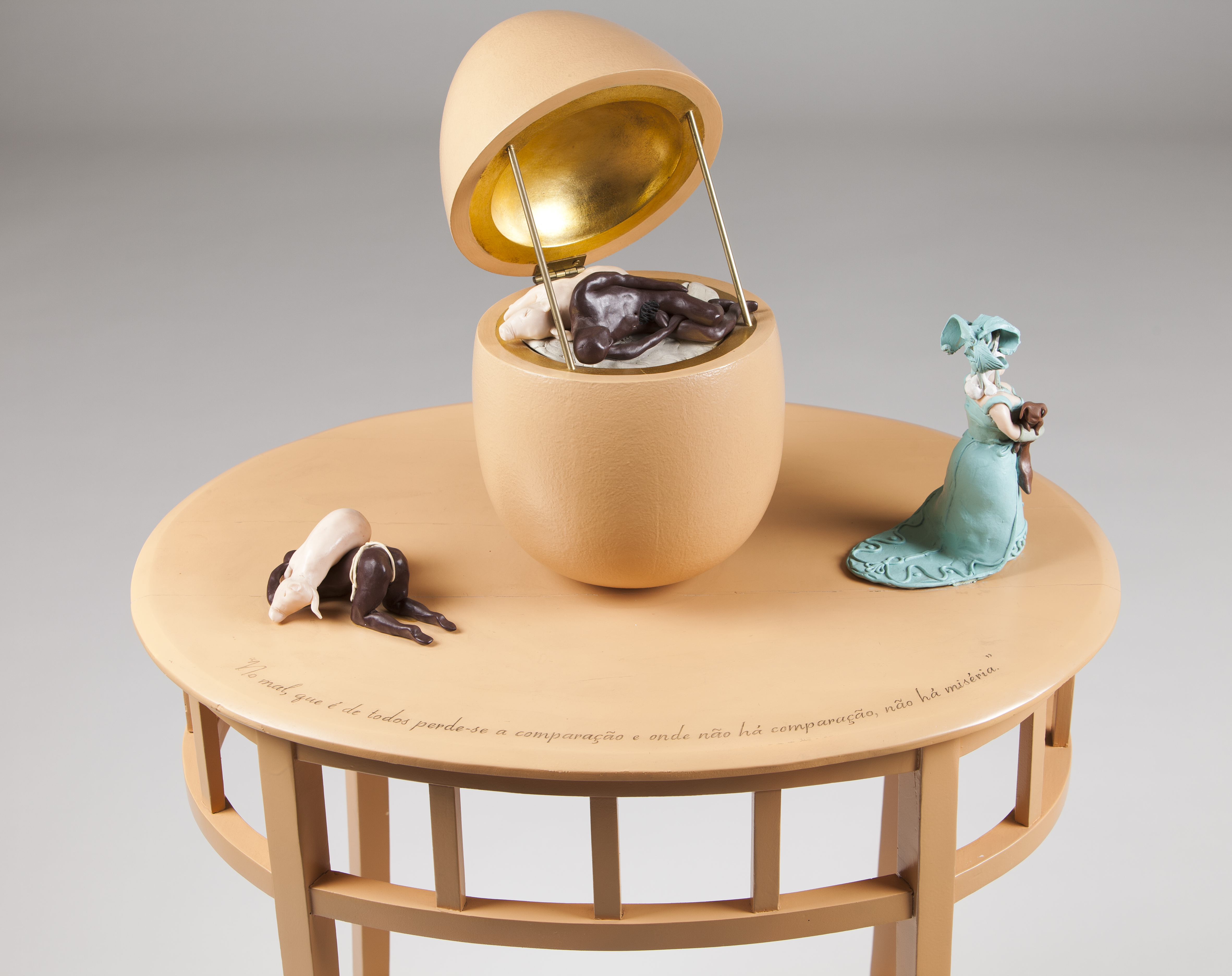 Table with painted wood egg, painted Fimo figures, metal and graphite