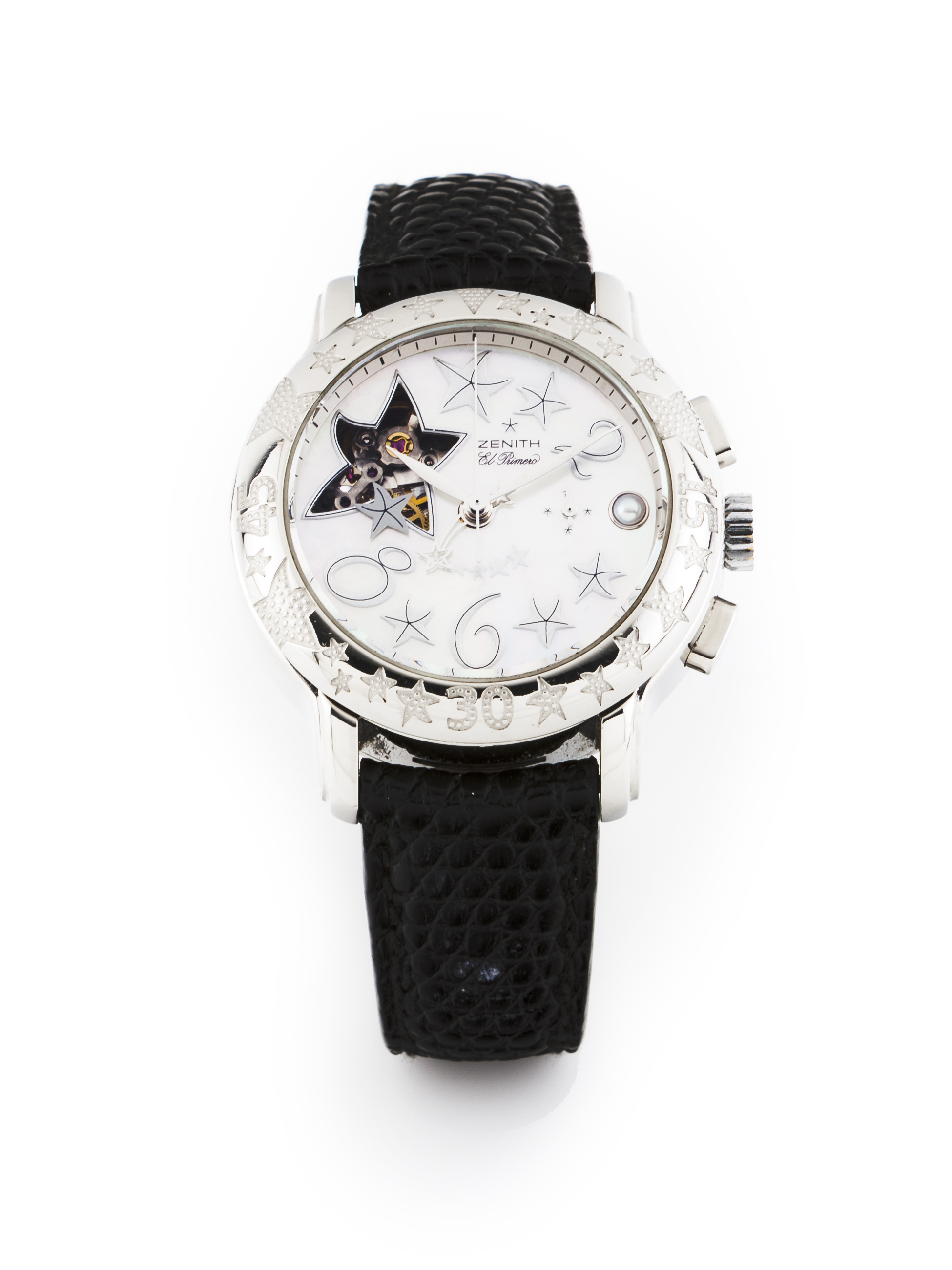 Star El Primero model. Automatic mechanical movement with chronograph function. Stainlees steel case with open caseback, mother of pearl dial and a pearl on the 15h index. In good condition.