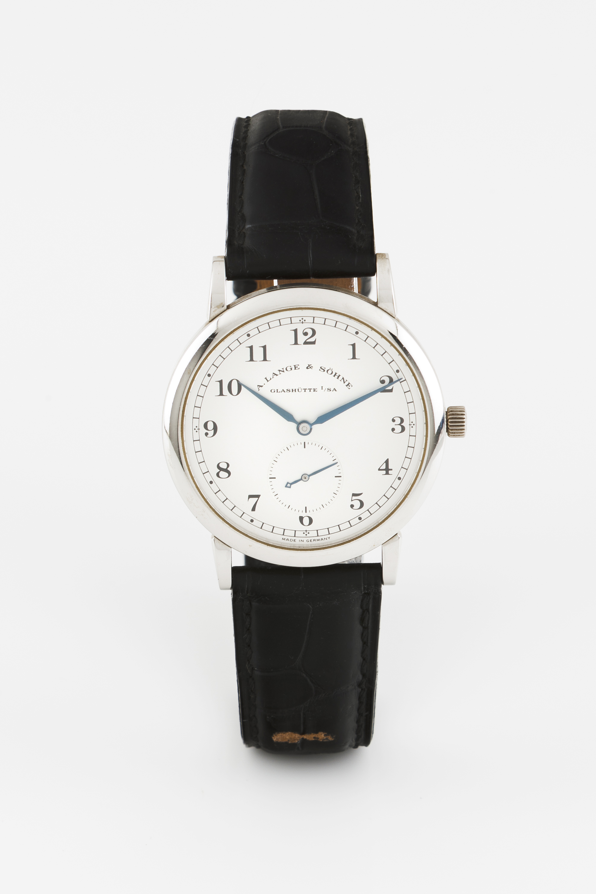 Relógio da marca A. Lange & Sohne. Movimento mecânico de corda manual. Caixa em platina (950/000) com movimento aparente. Bom estado de conservação.