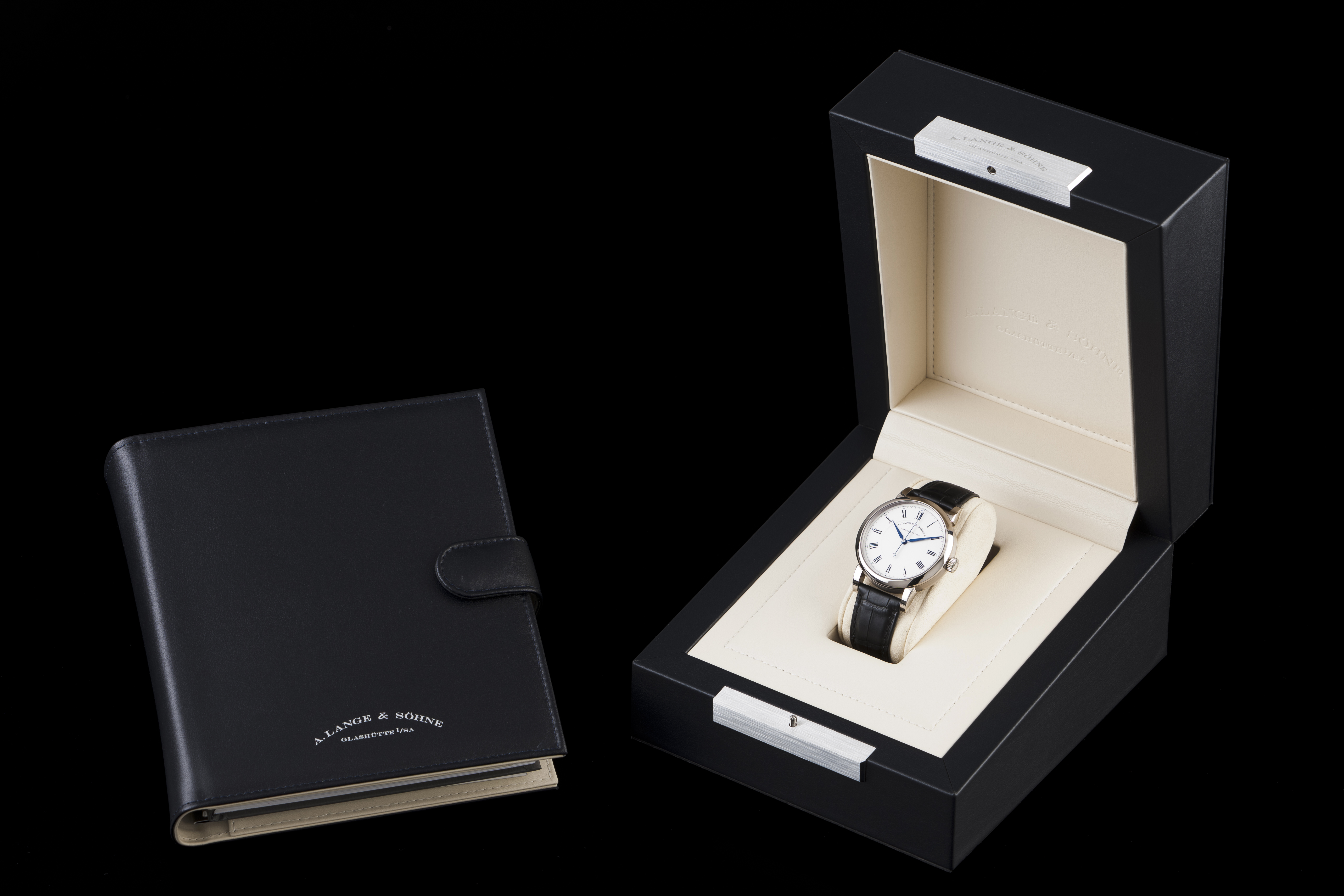 Modelo Richard Lange com ref. NºLS2323AJ. Movimento mecânico de corda manual com nº de série 122160. Caixa em ouro branco (750/000) com movimento aparente e com registo Nº240198. Relógio novo, nunca usado. Acompanha caixa e documentos.