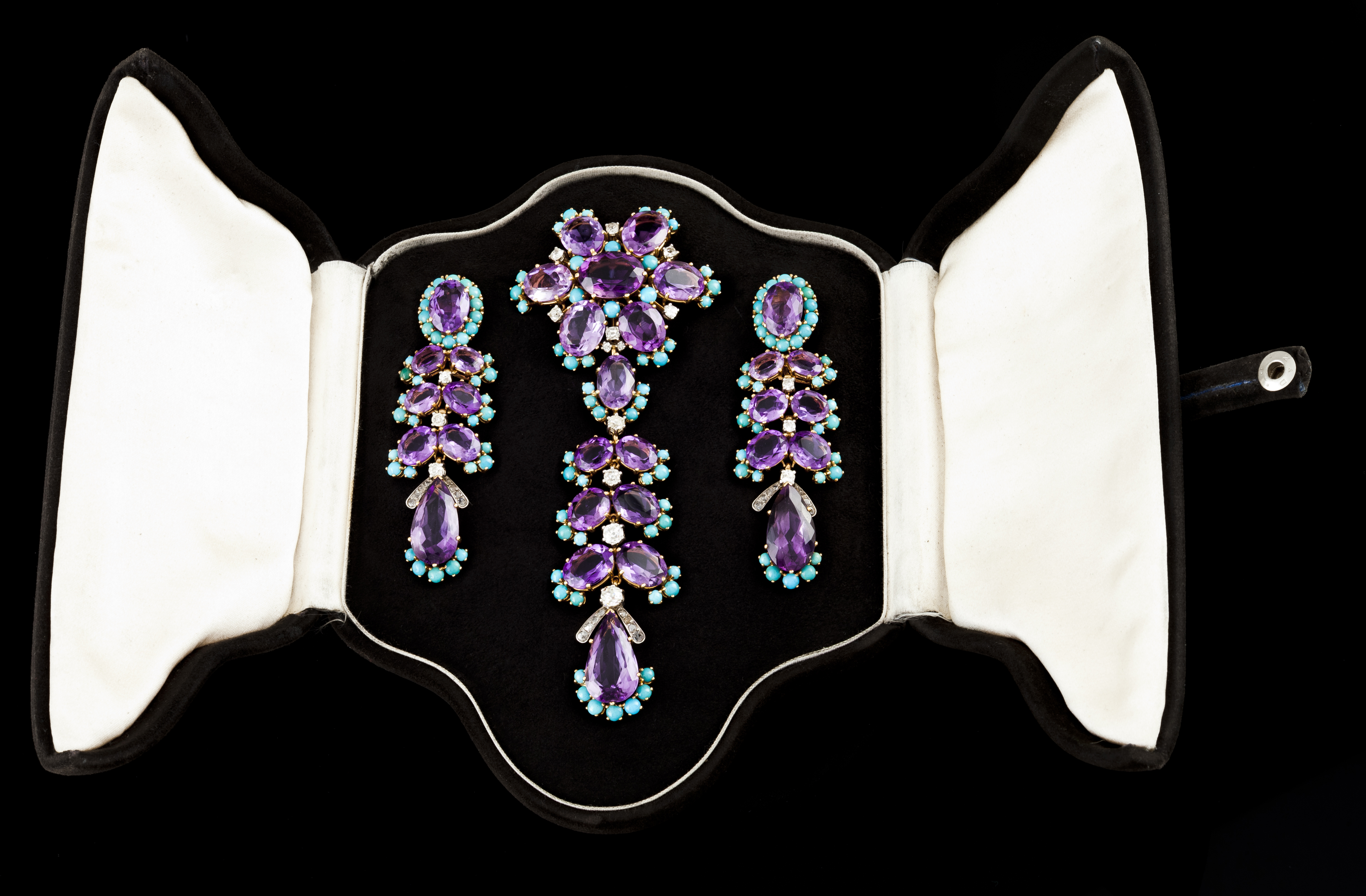 Composto por alfinete com pendente amovível cravejado com 14 ametistas em talhe oval e uma em talhe periforme, 12 diamantes em talhe antigo de brilhante com total (ca.1.80ct) e pequenas turquesas redondas em talhe de cabochão