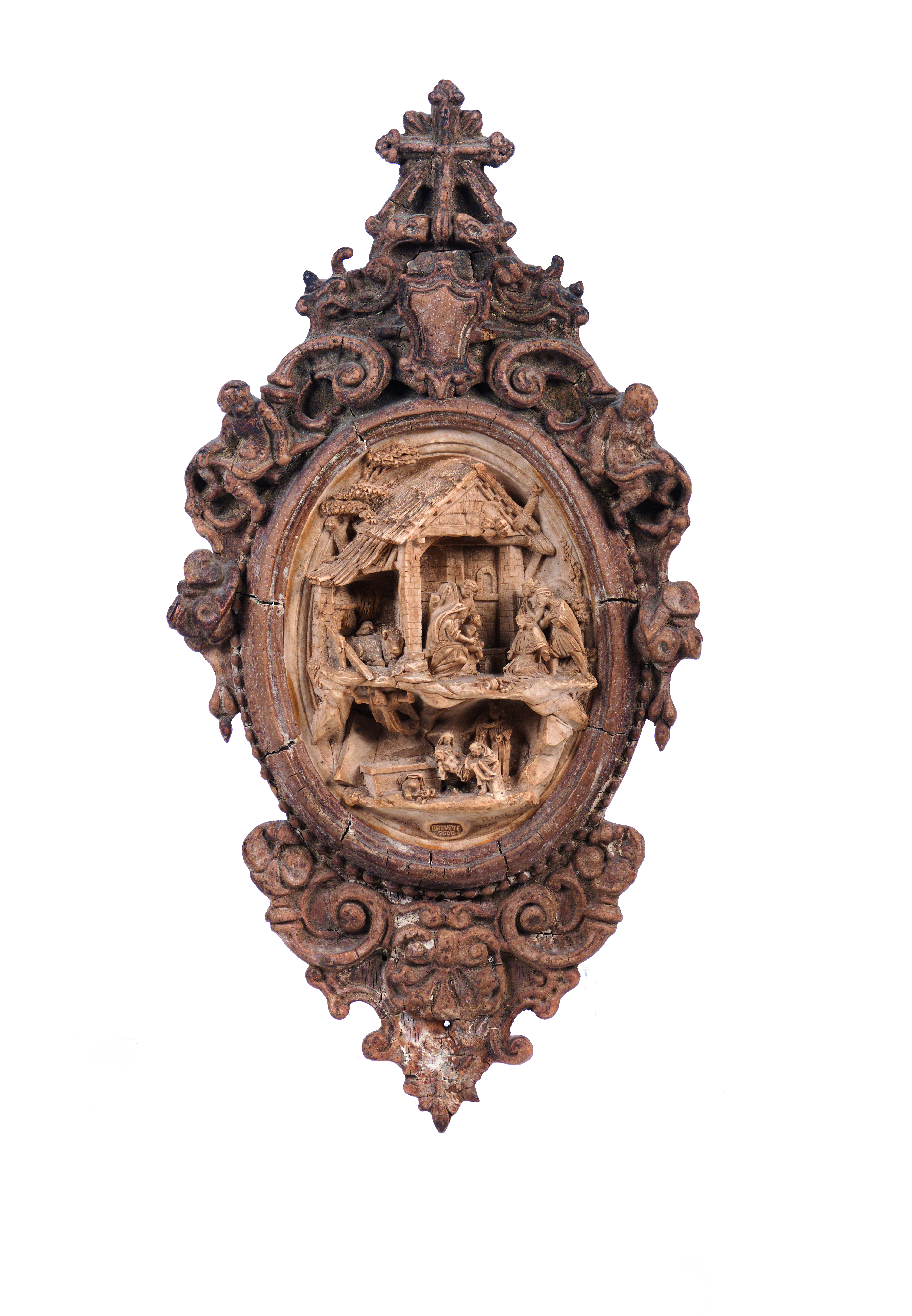 Moldura em madeira e gesso representando concheados, enrolamentos, putti e encimada por Cruz