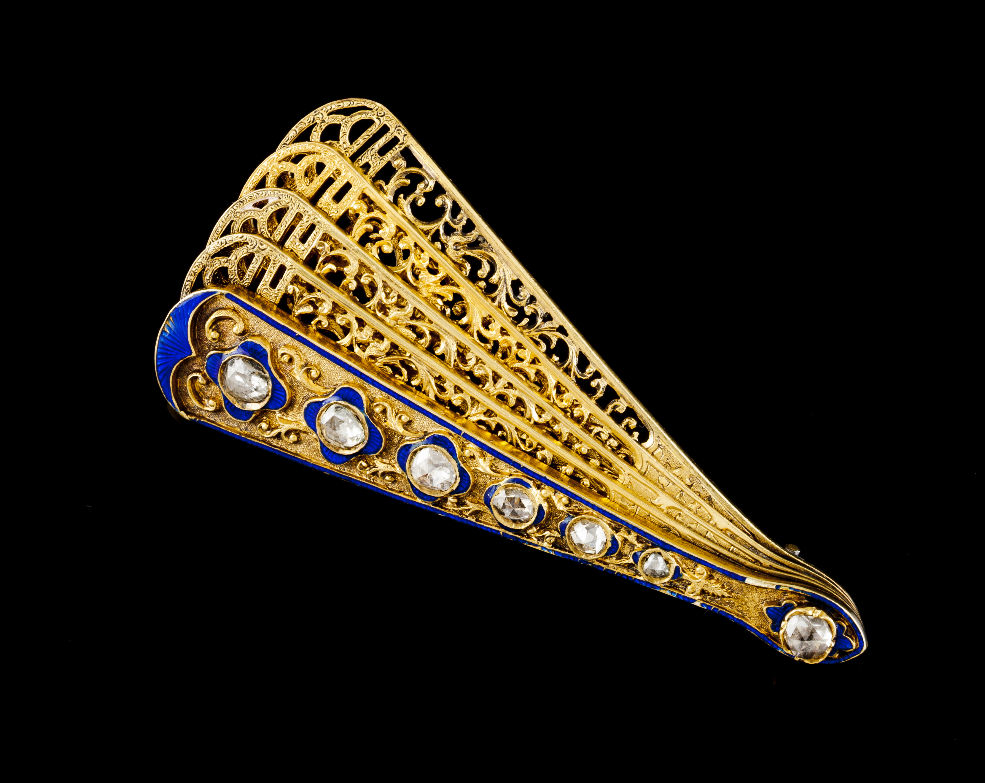 Leque com varetas articuladas vazadas com aplicações a esmalte azul cravejado com 6 diamantes em talhe de rosa coroada