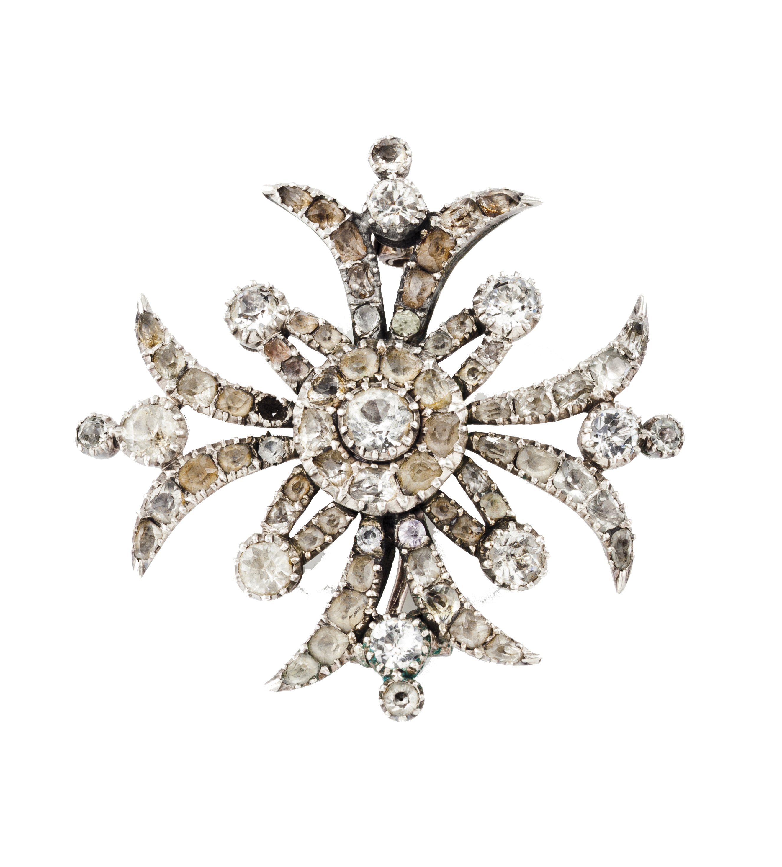 Cruz estilizada com decoração vegetalista cravejada com minas novas