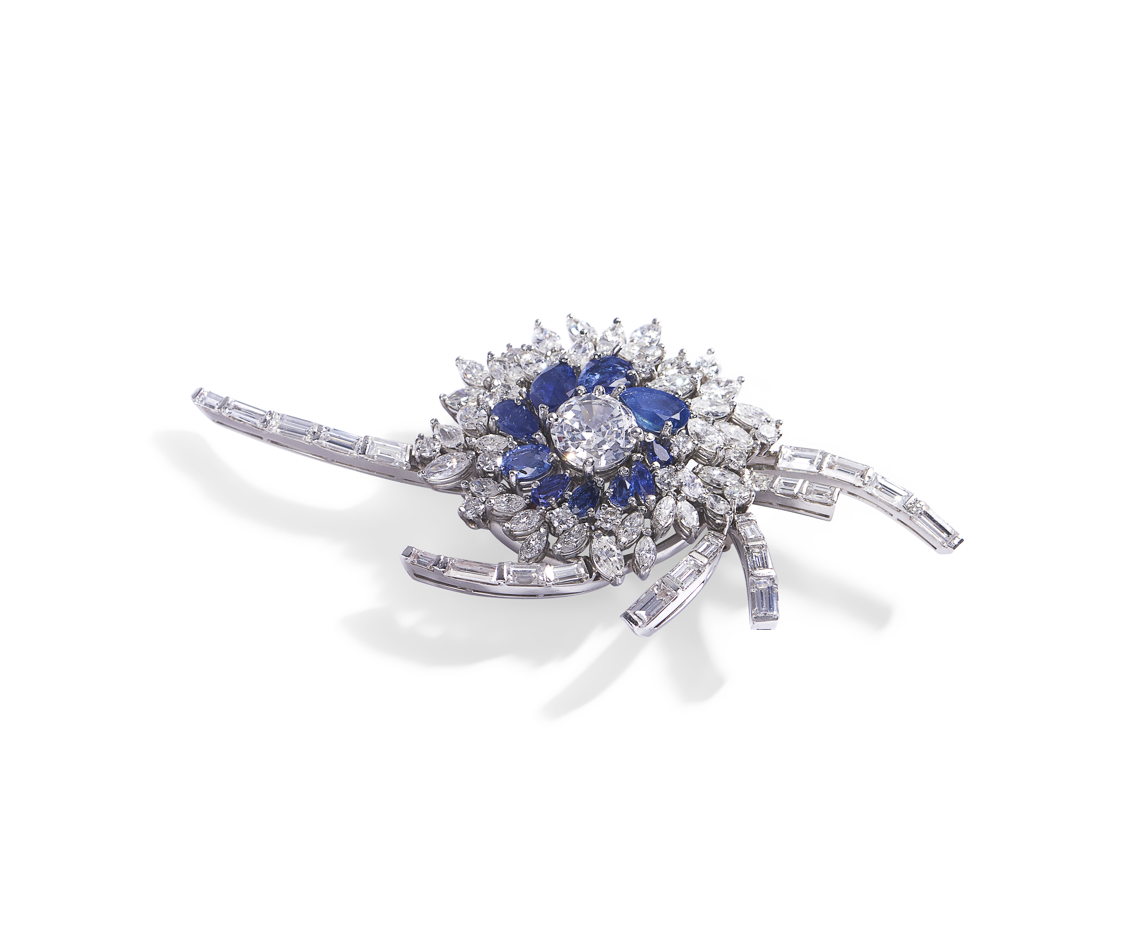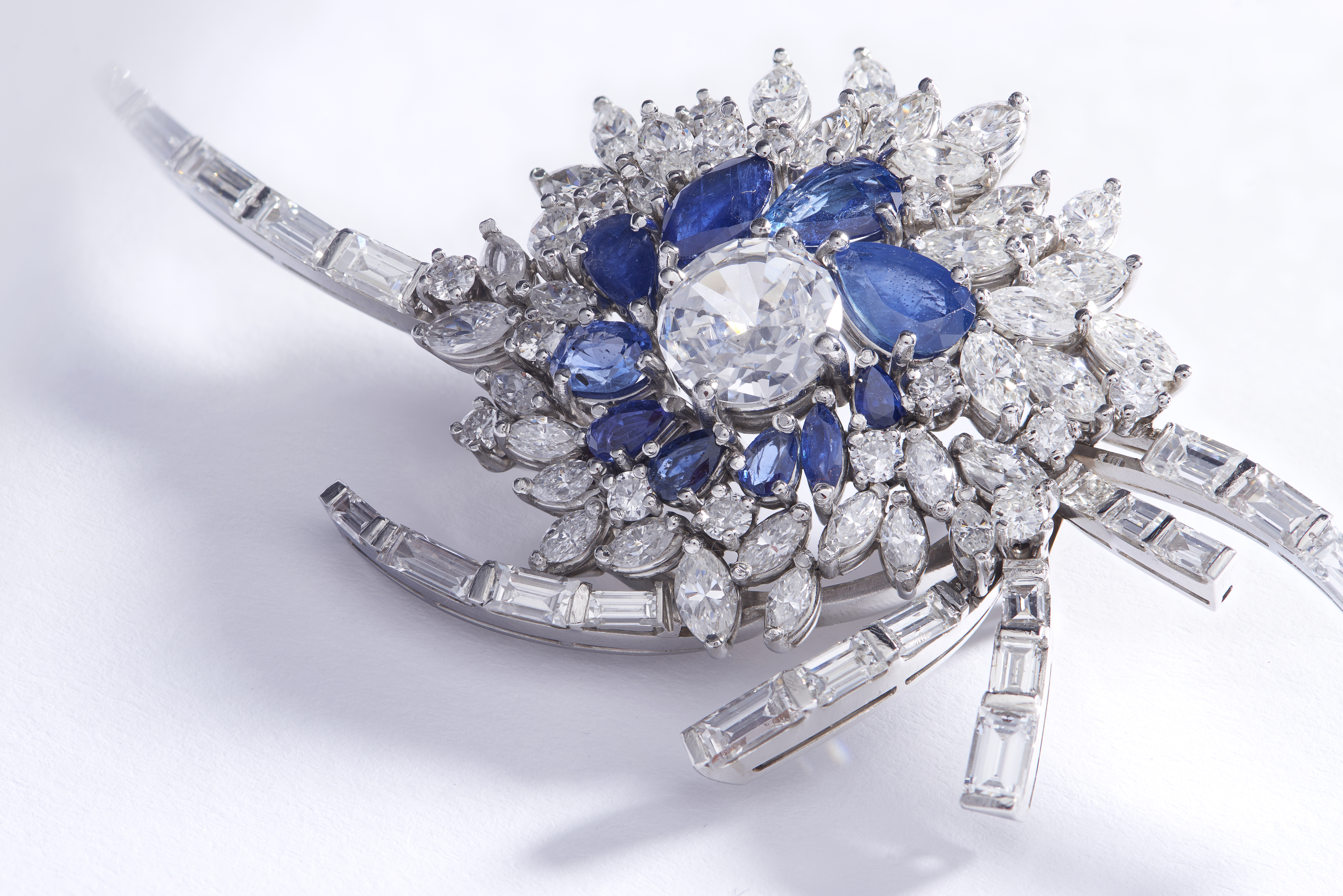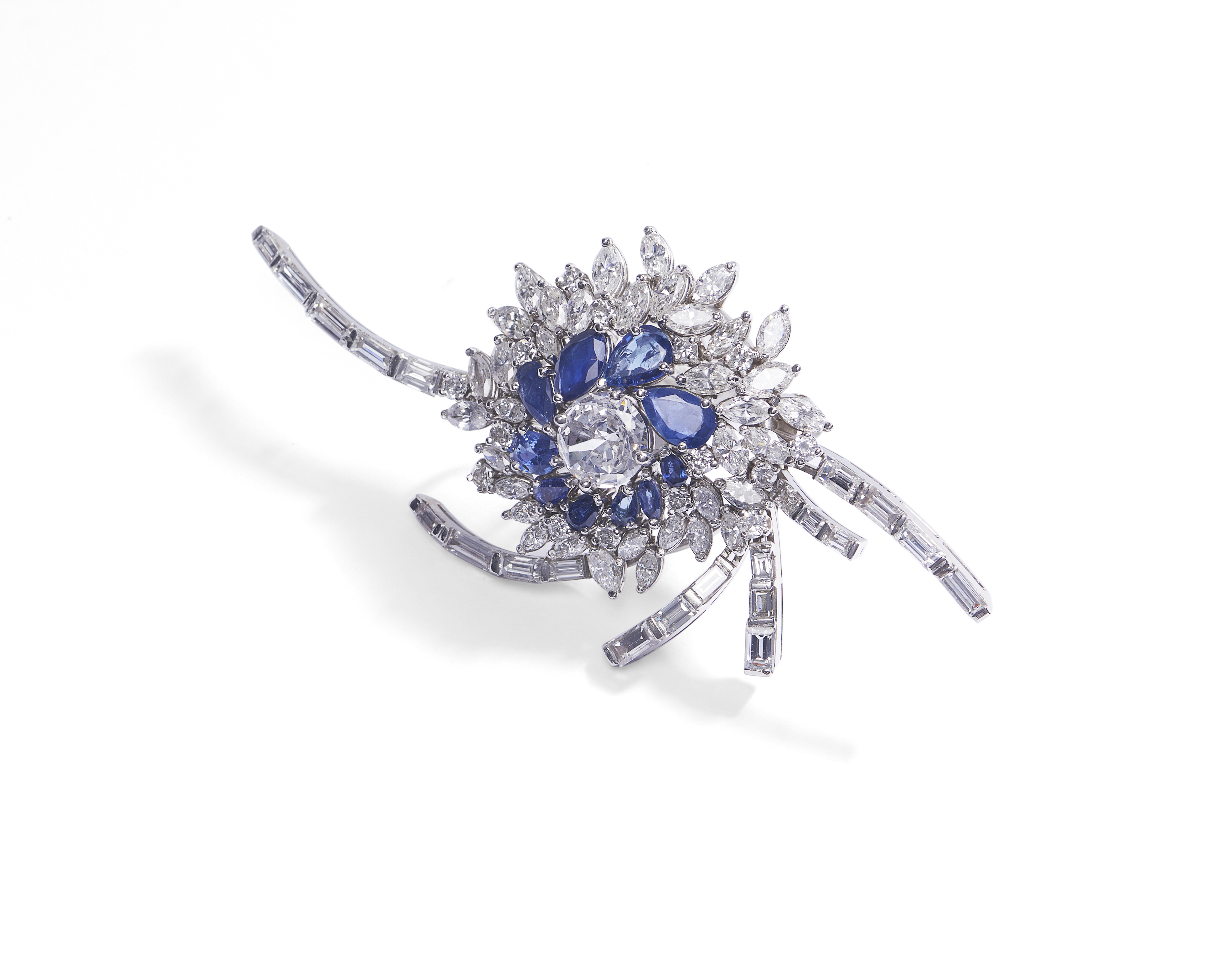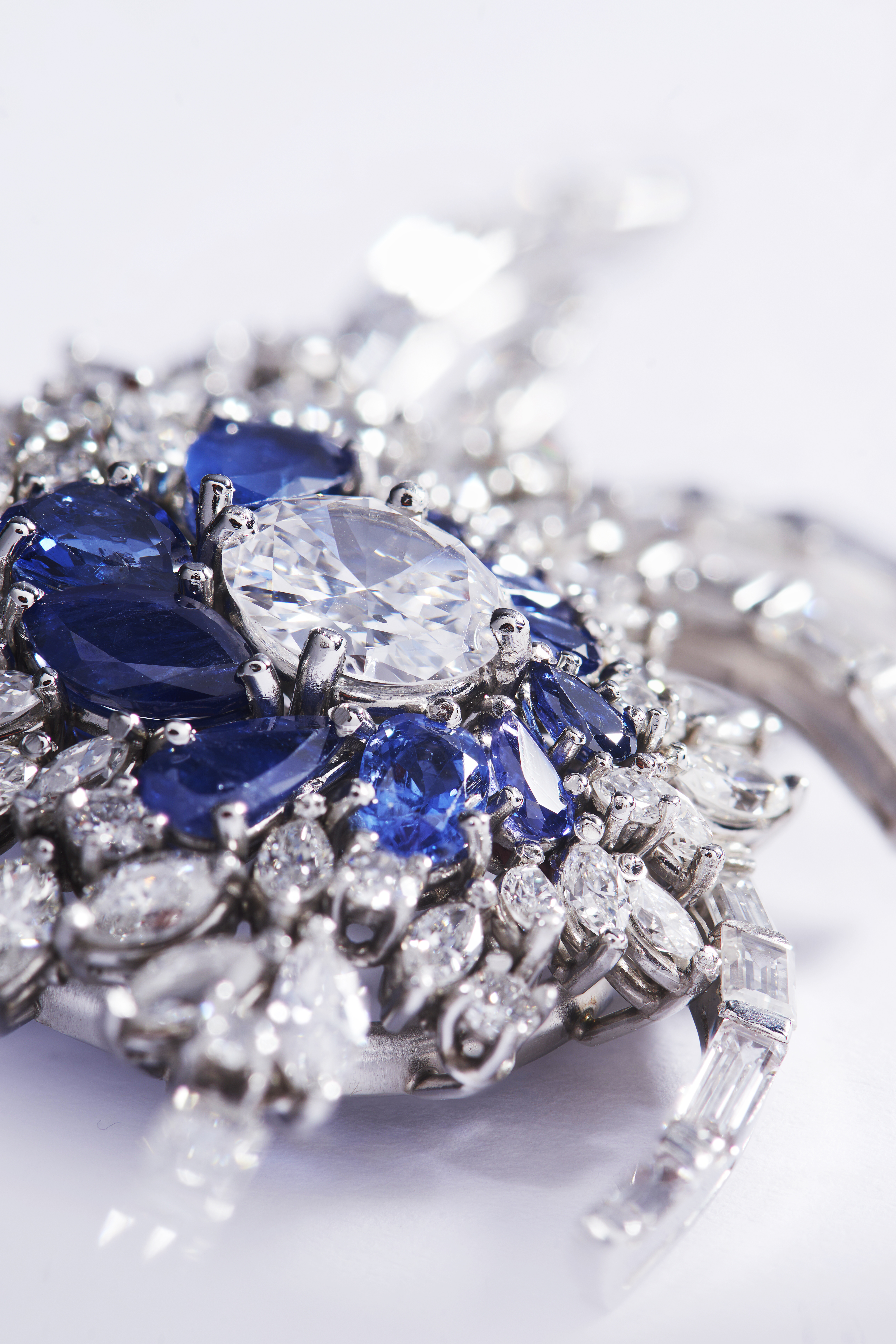 Cravejado com 10 safiras em talhe gota, 36 diamantes em talhe navete com o peso aproximado de 4,70 ct., 22 em talhe baguete com o peso aproximado de 2,20 ct. e 15 diamantes em talhe de brilhante com o peso aproximado de 0,90 ct., tendo o central o peso aproximado de 2, 30 ct., grau de cor E~F, pureza SI2 e fluorescência forte