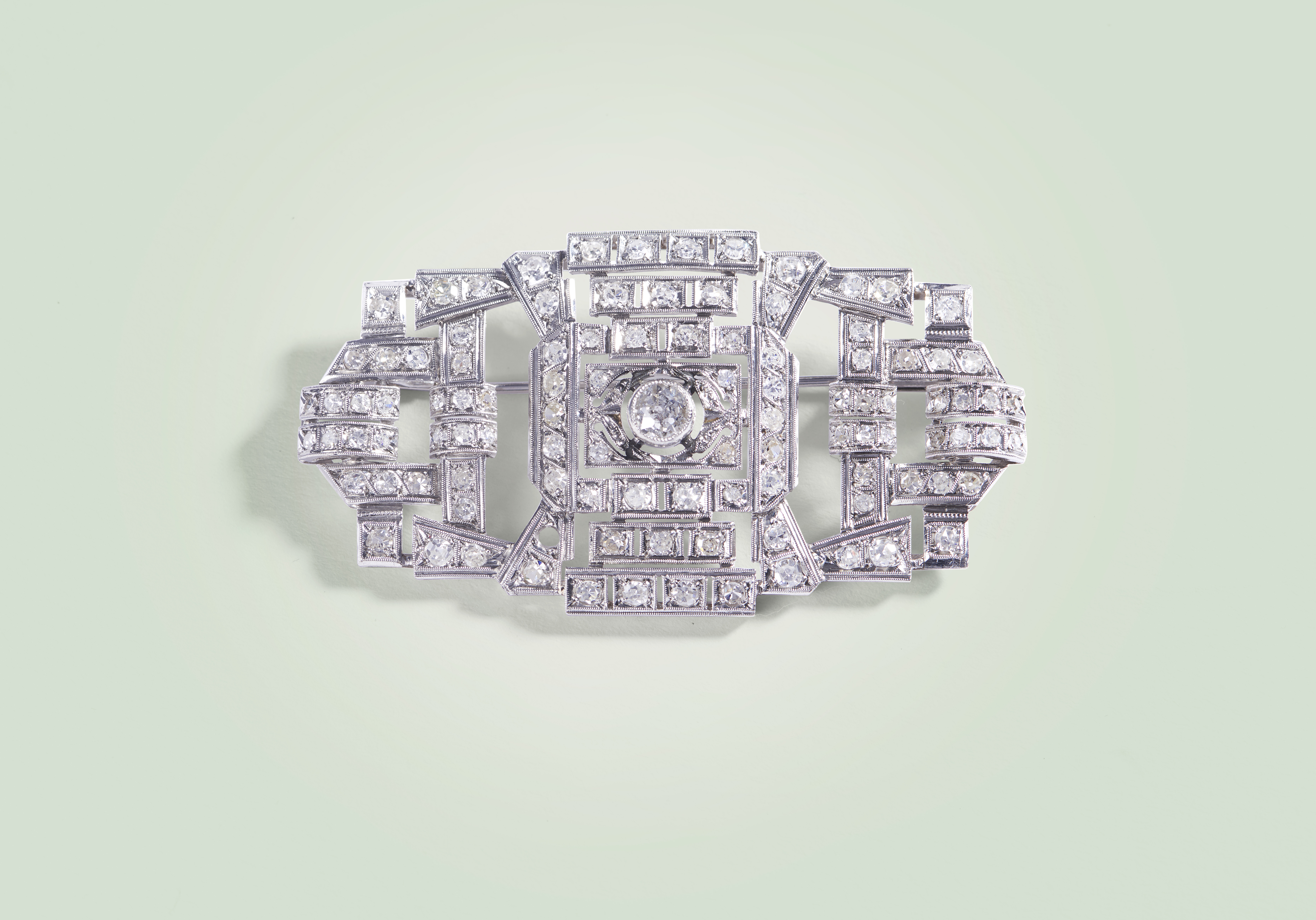 Cravejado com 61 diamantes em talhe 8/8 com o peso aproximado de 2,44 ct. e o central com o peso aproximado de 0,40 ct.