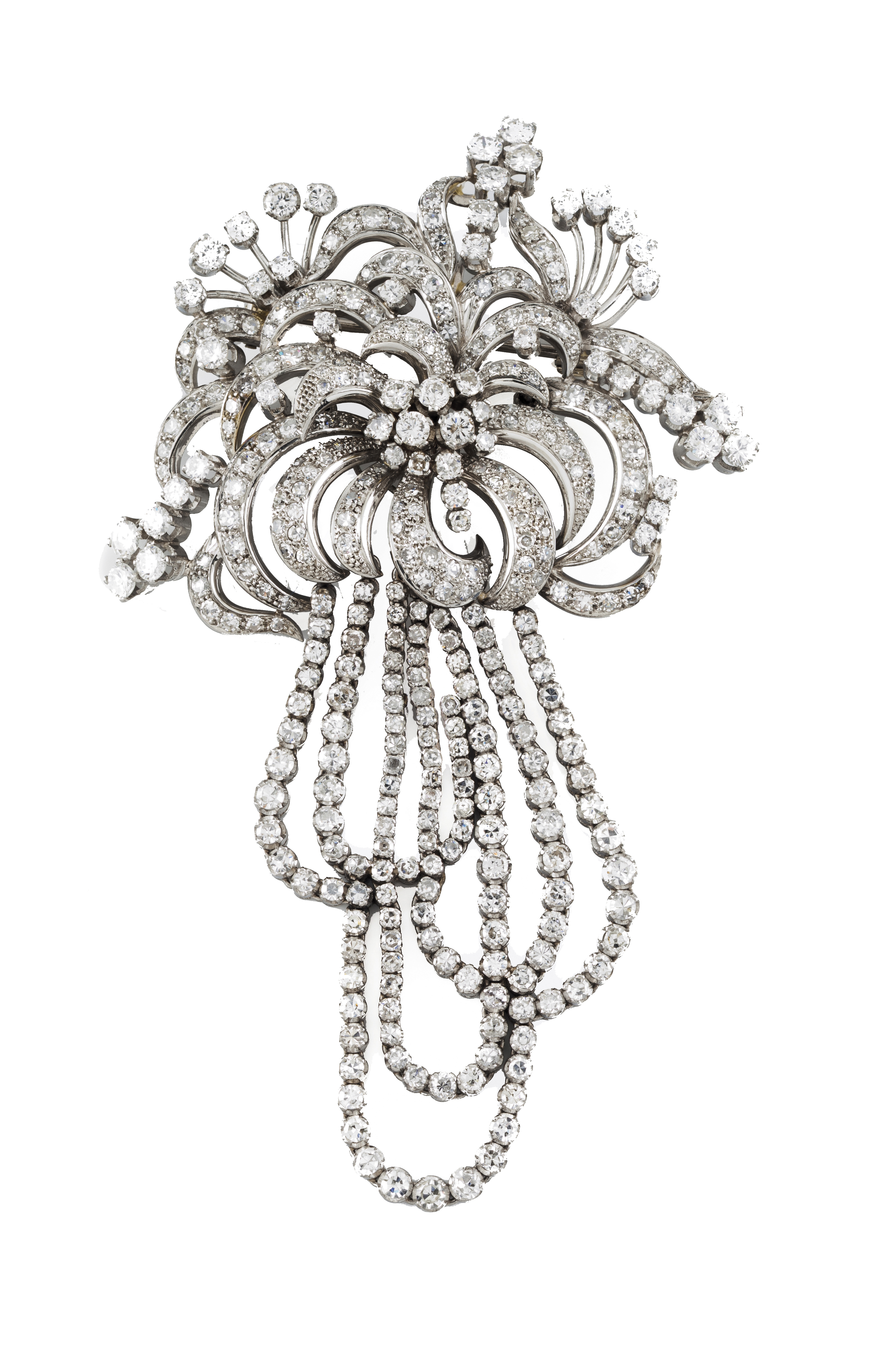 Decoração vegetalista estilizada ao estilo victoriano com elementos pendentes articulados em forma de franjas entrelaçadas, inteiramente cravejado com diamantes em talhe de brilhante e talhe 8/8 com total (ca.20.10ct)