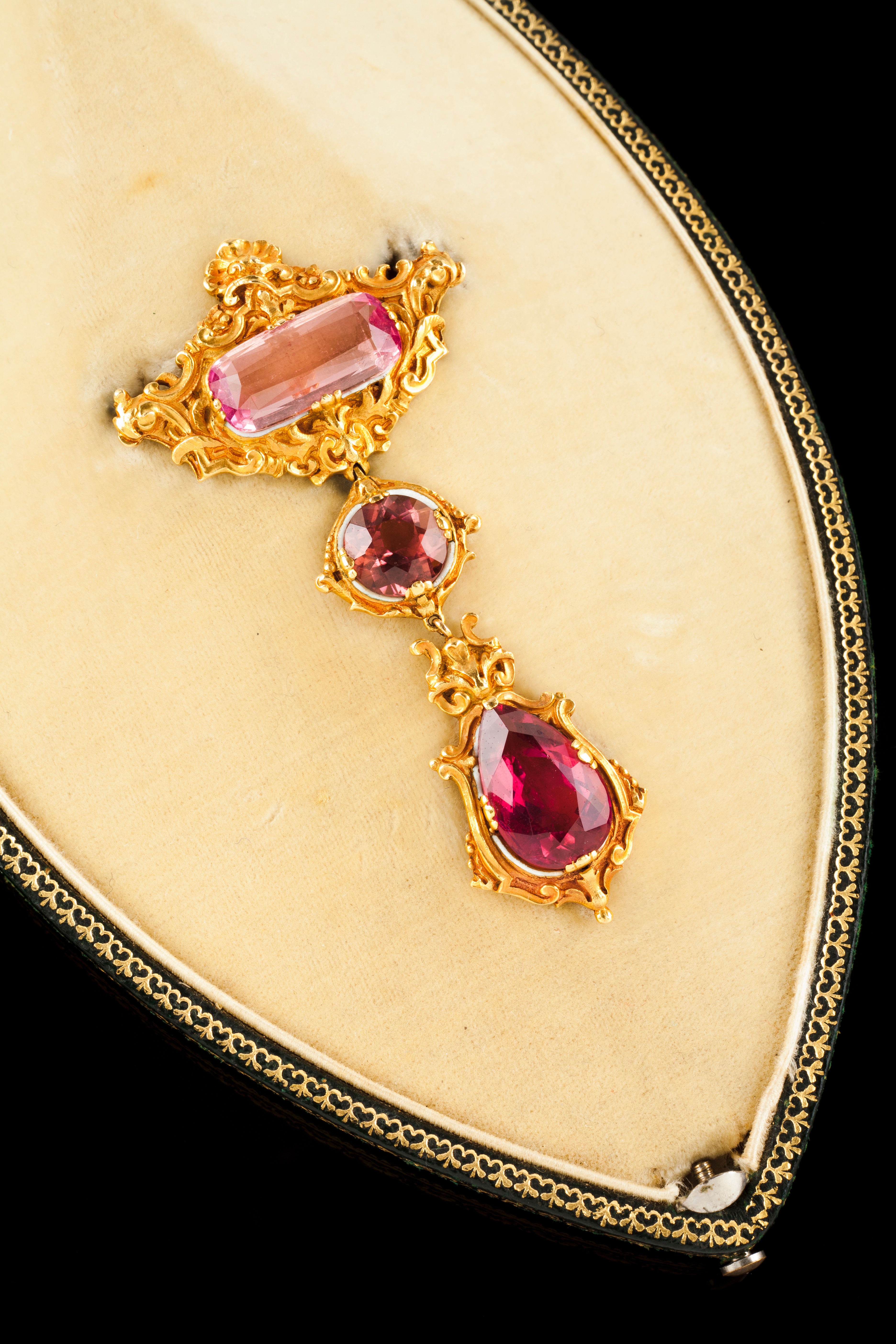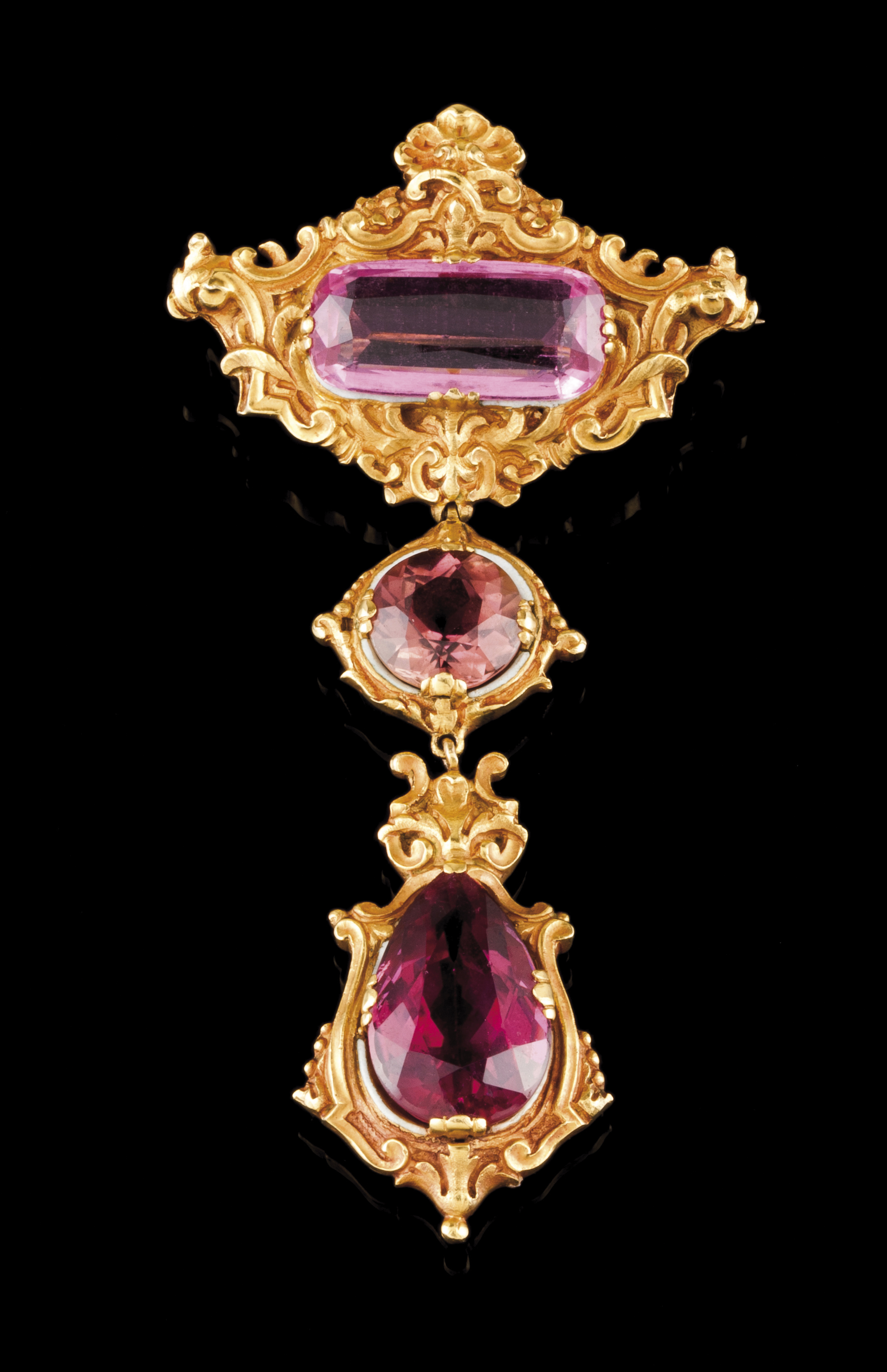 Em ouro cinzelado ao gosto barroco, parcialmente esmaltado a branco e cravejado com três turmalinas cor-de-rosa de tonalidades decrescentes