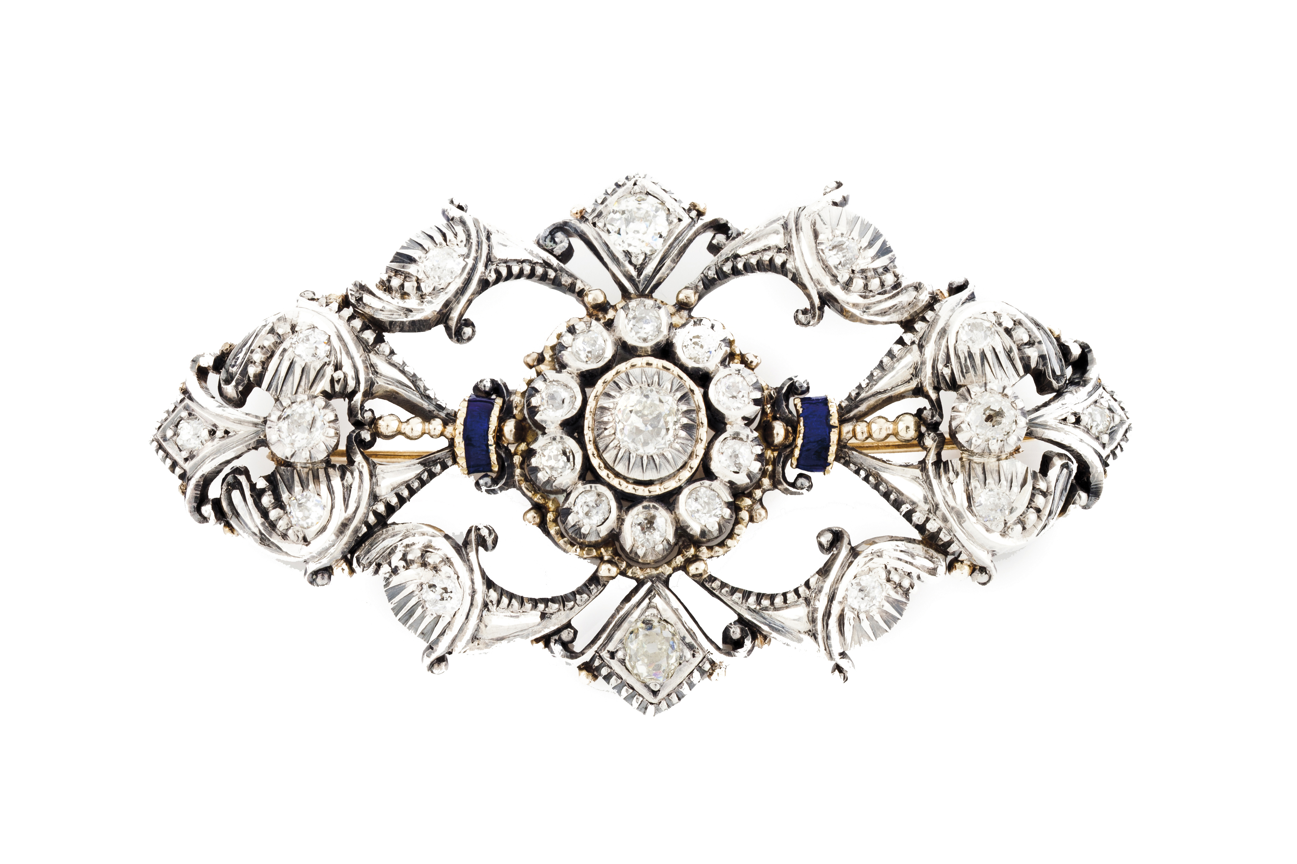 Decoração vazada com enrolamentos, elemento central em forma de flor estilizada cravejado com 25 diamantes em talhe antigo de brilhante com total (2.30ct) e aplicação de esmalte azul