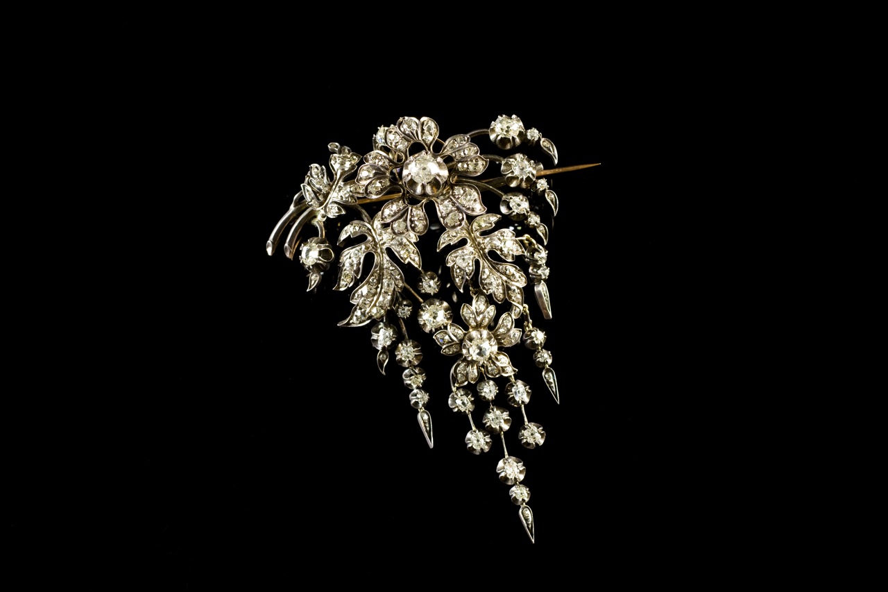 Em prata e ouro, cravejado com diamantes talhe rosa e em talhe