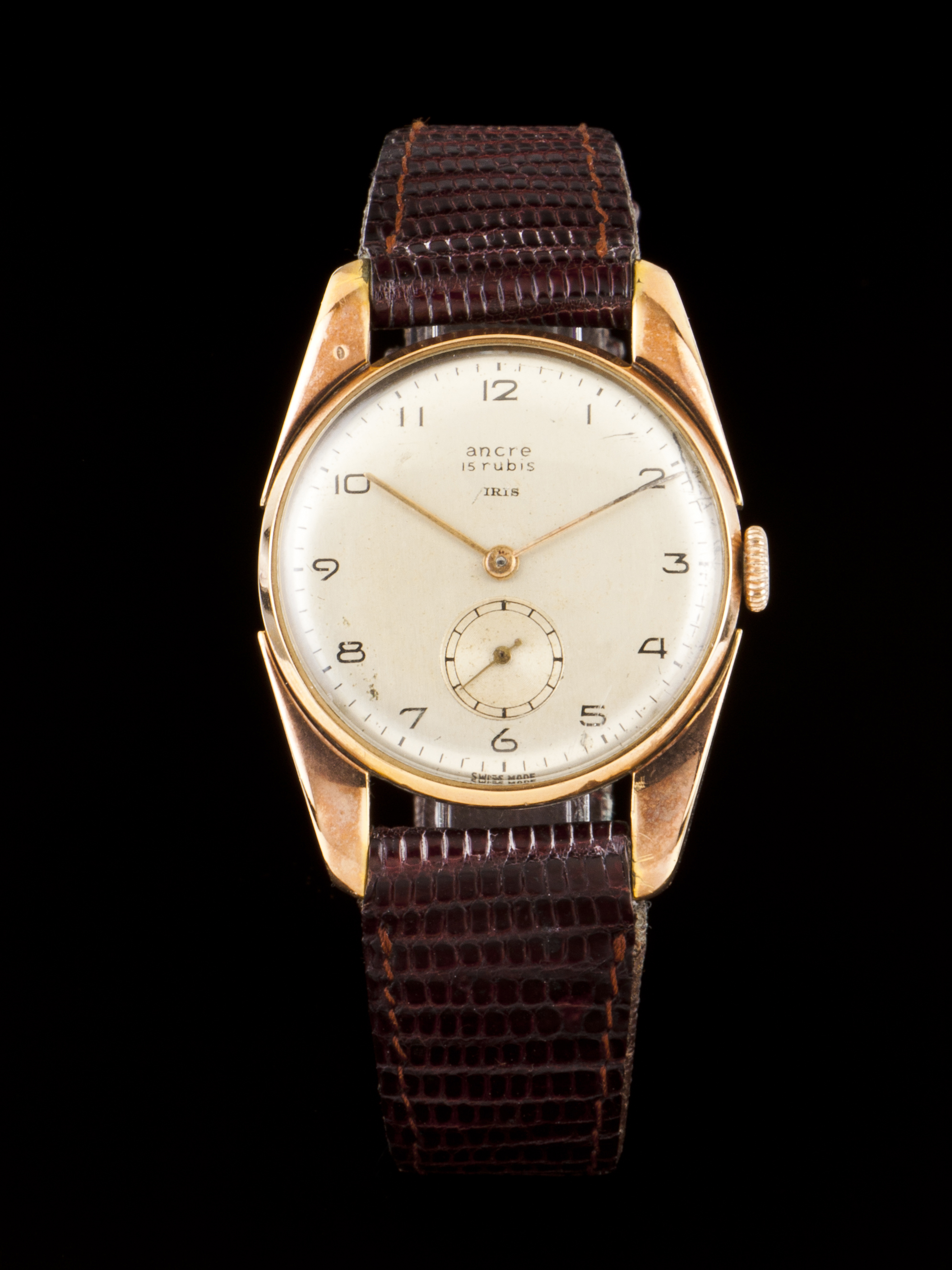 Relógio Ancre, caixa em plaquê com asas de raro design e 34mm de diâmetro. Movimento mecânico de corda manual. Bracelete em pele. Peça com marcas de uso dos anos 50.