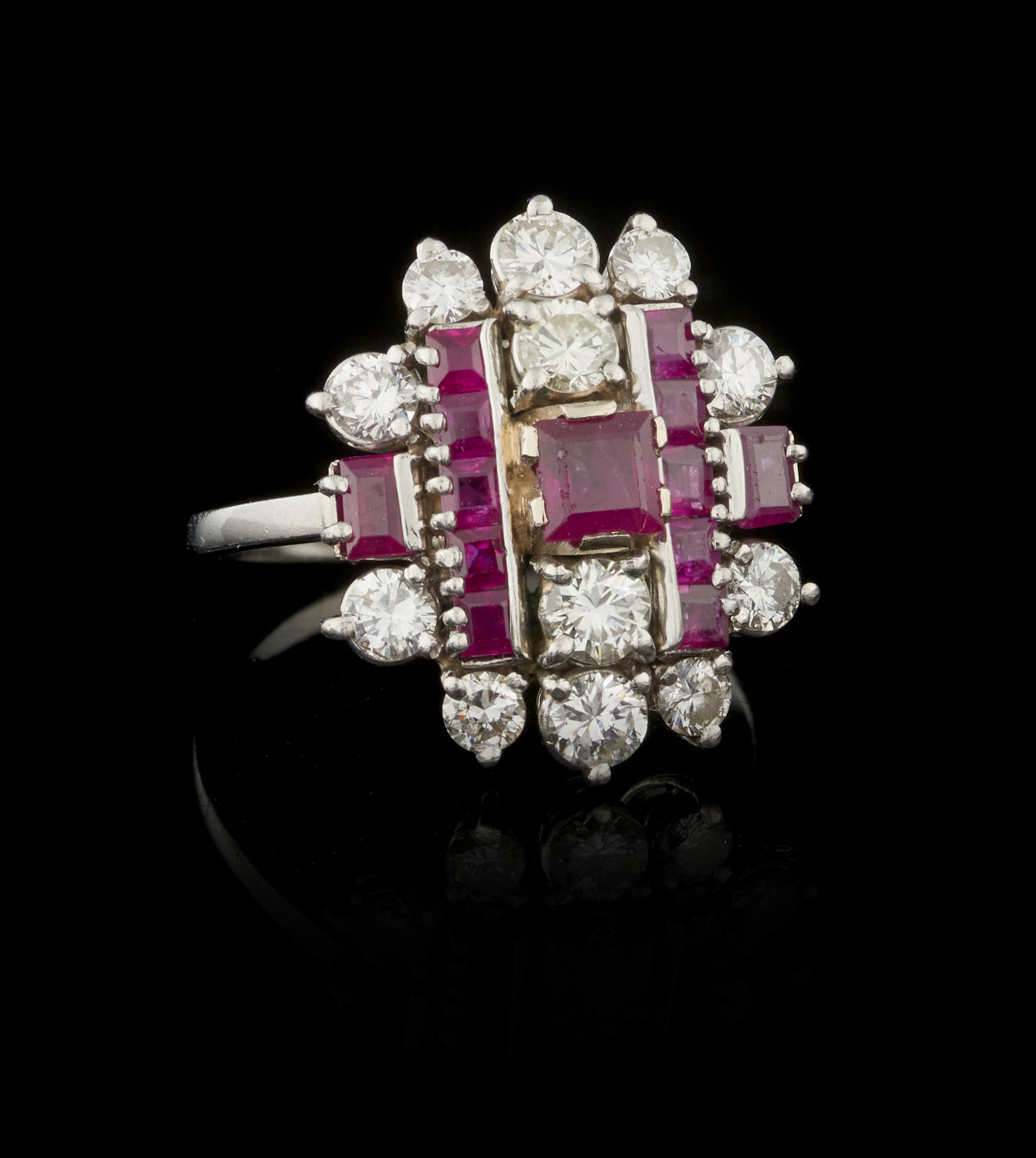 Cravejado com rubi em talhe carré e 12 diamantes em talhe de brilhante com o peso aproximado de 1 ct.