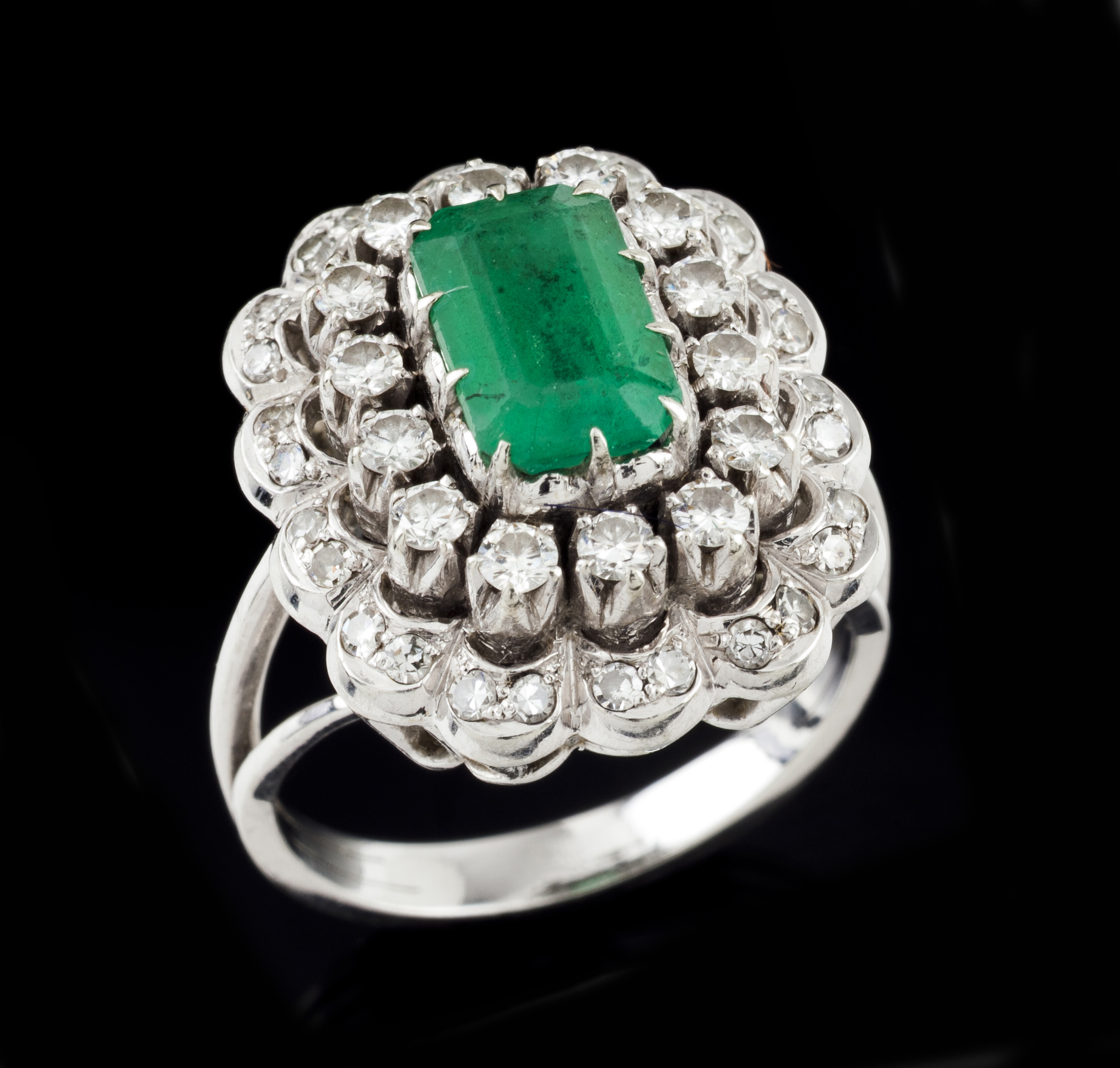 Cravejado com uma esmeralda em talhe esmeralda (ca. 9.2x5,7mm) emoldurada por 14 diamantes em talhe de brilhante (ca. 0.40ct) e 28 com total (ca. 0.20ct)