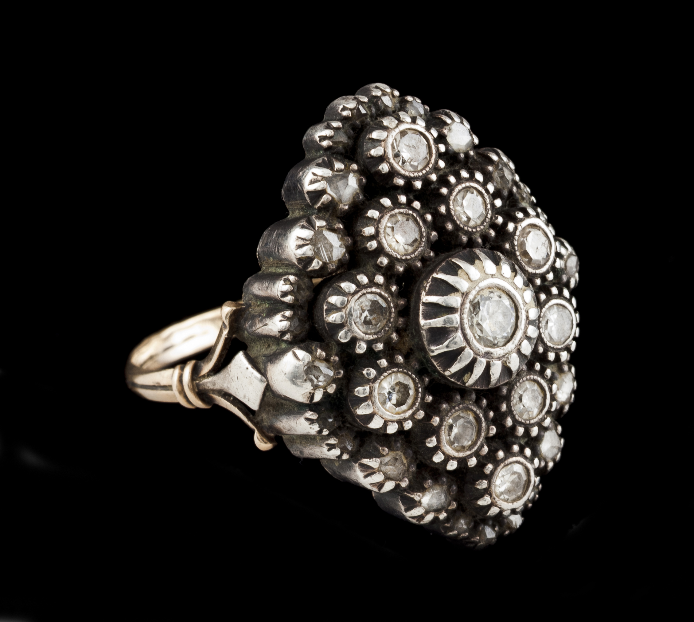Cravejado com diamantes em talhe rosa, 10 diamantes em talhe 8/8 e 1 em talhe de brilhante com o peso total aproximado de 0,40 ct.