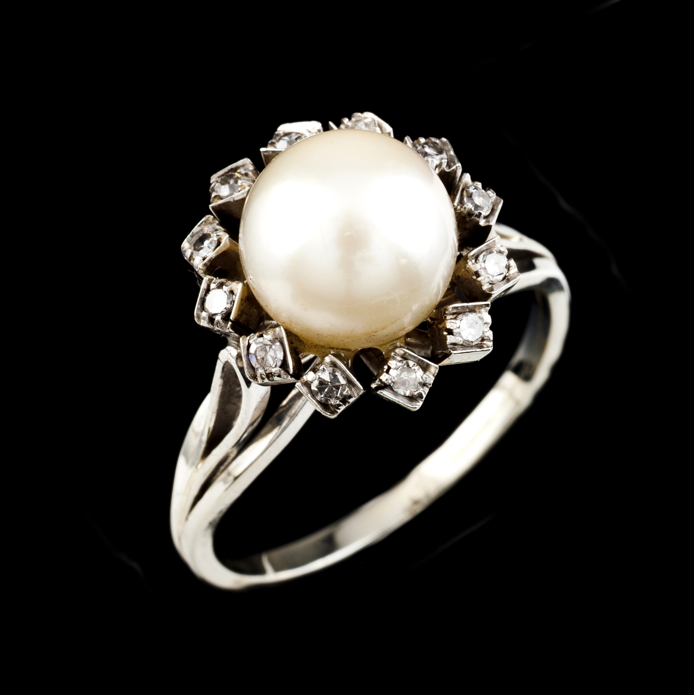 Cravejado com pérola de cultura (9 mm) (não testada) e 12 diamantes em talhe 8/8 com o peso aproximado de 0,12 ct.