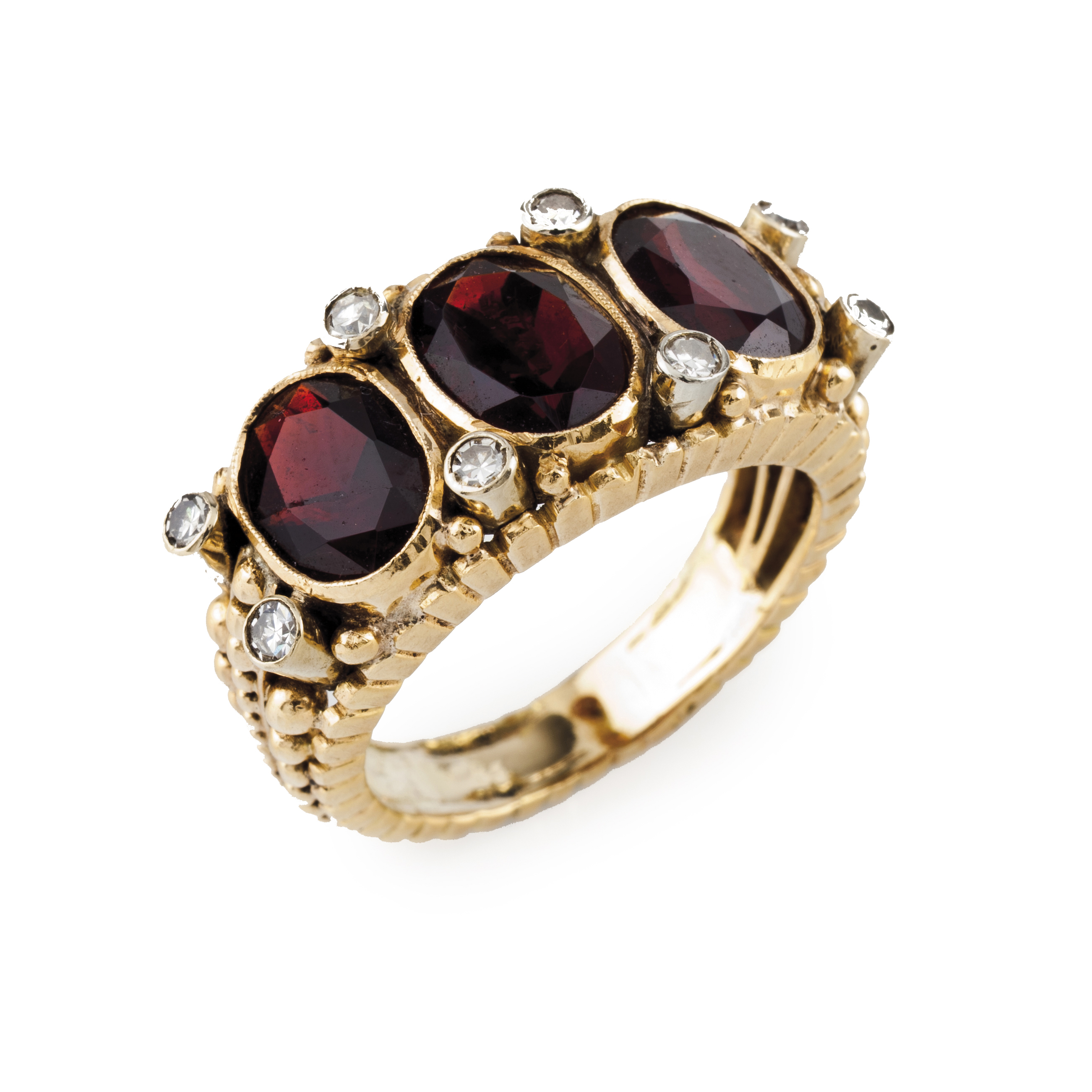 Decoração de granitos cravejado com 3 granadas em talhe oval e pequenos diamantes em talhe rosa