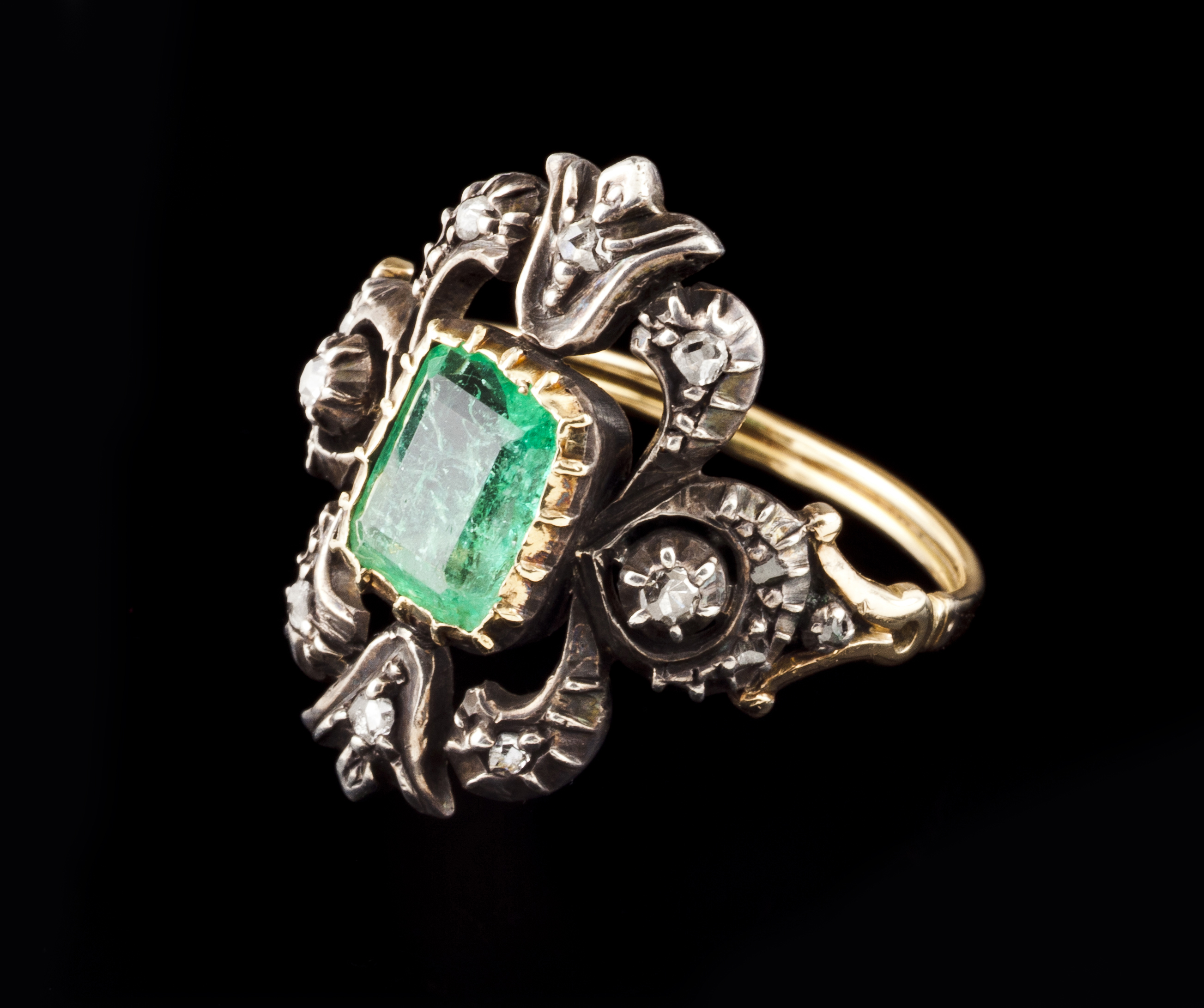 Em ouro e prata cravejado com uma esmeralda rectangular e pequenos diamantes talhe rosa e 8/8
