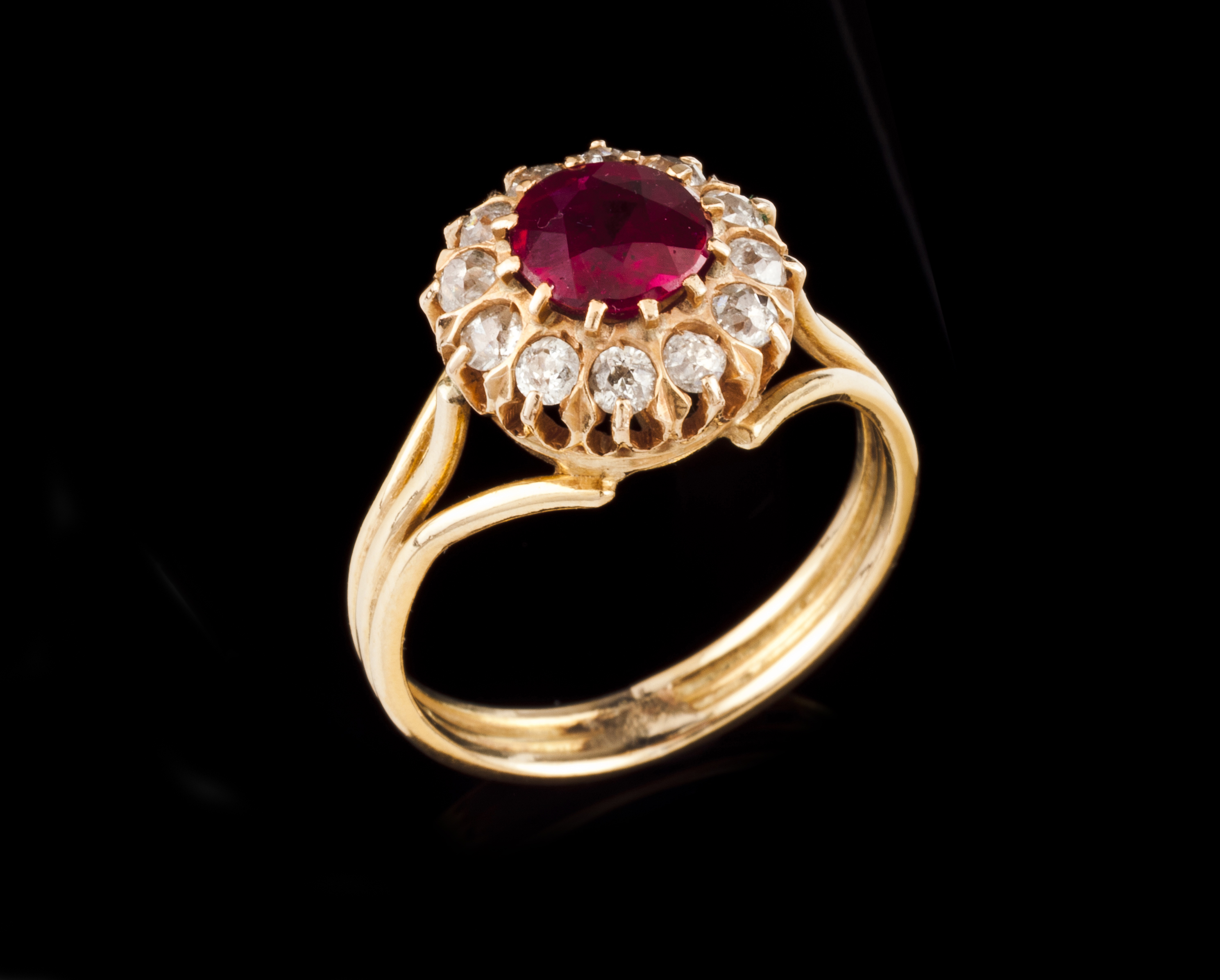 Em ouro cravejado com um rubi sintético talhe redondo e 12 diamantes talhe antigo de brilhante (ca. 0,54ct)