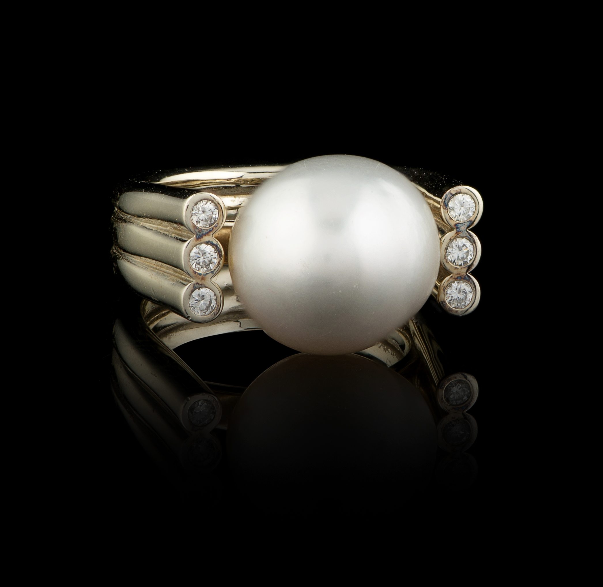 Cravejado com pérola dos Mares do Sul barroca e 6 diamantes em talhe de brilhante com o peso aproximado de 0,18 ct.