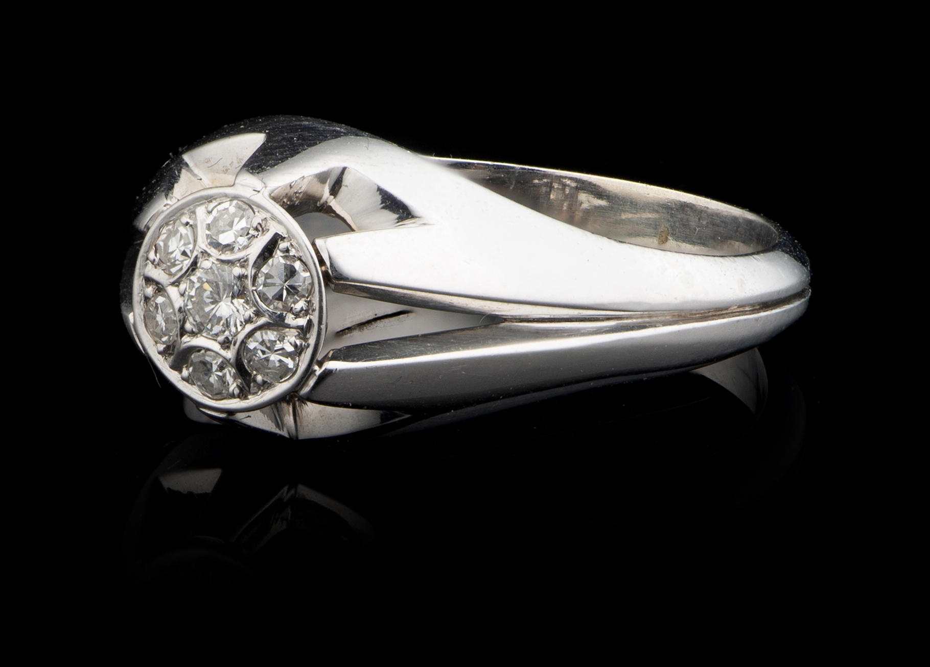 Cravejado com 6 diamantes em talhe 8/8 e 1 em talhe de brilhante com o peso total aproximado de 0,20 ct.