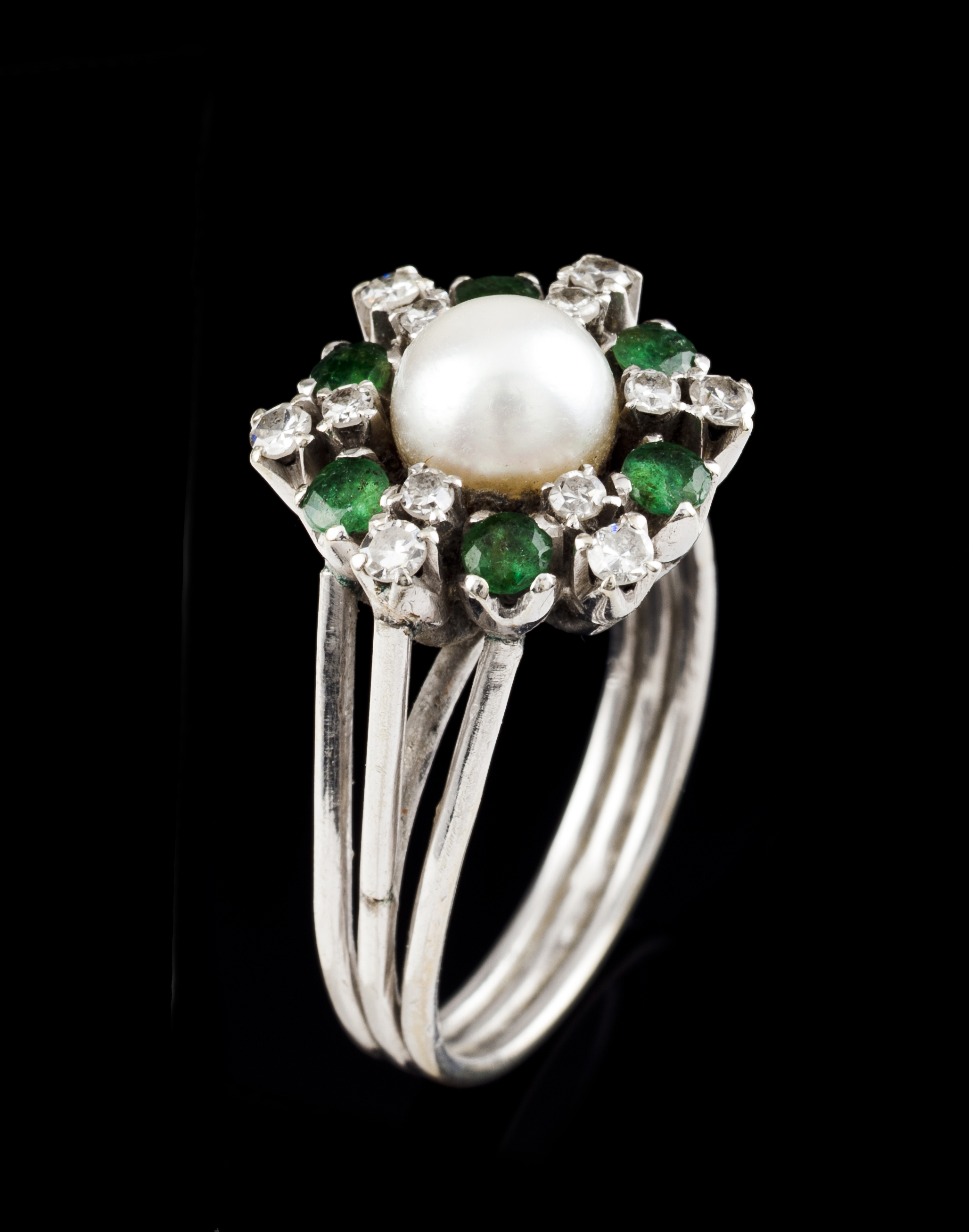 Cravejado com pérola de cultura (6,5 mm) (não testada), esmeraldas e 12 diamantes em talhe 8/8 com o peso aproximado de 0,25 ct.