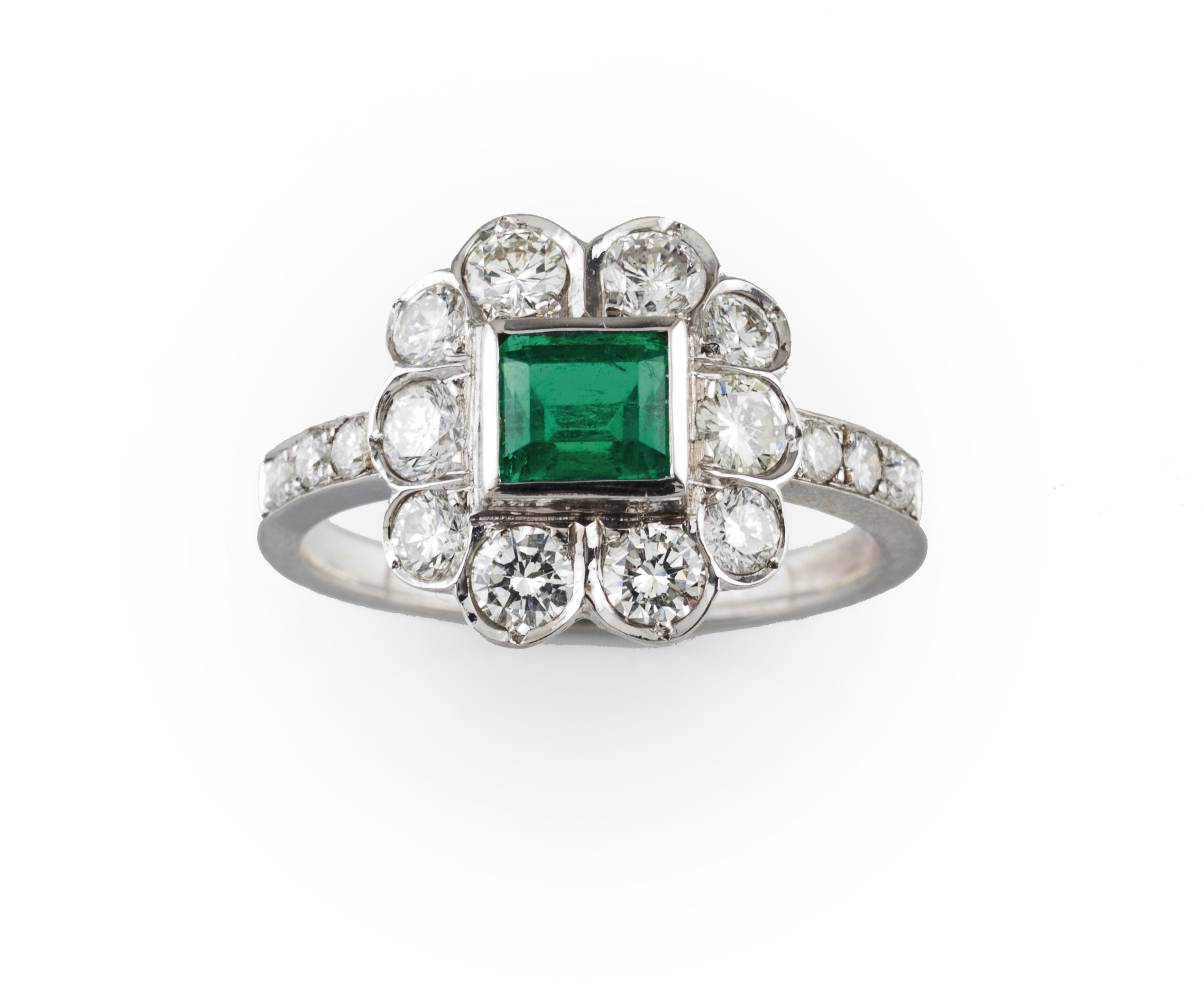 Cravejado com uma esmeralda colombiana em talhe dito de esmeralda (ca. 4,5x5 mm) e 16 diamantes em talhe de brilhante com total (1.65ct) de cor branca e pureza vvs