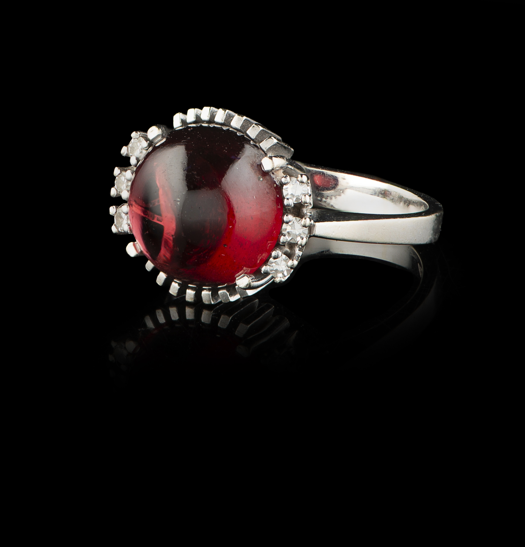 Cravejado com granada em talhe cabochon e 6 diamantes em talhe 8/8 com o peso aproximado de 0,18 ct.