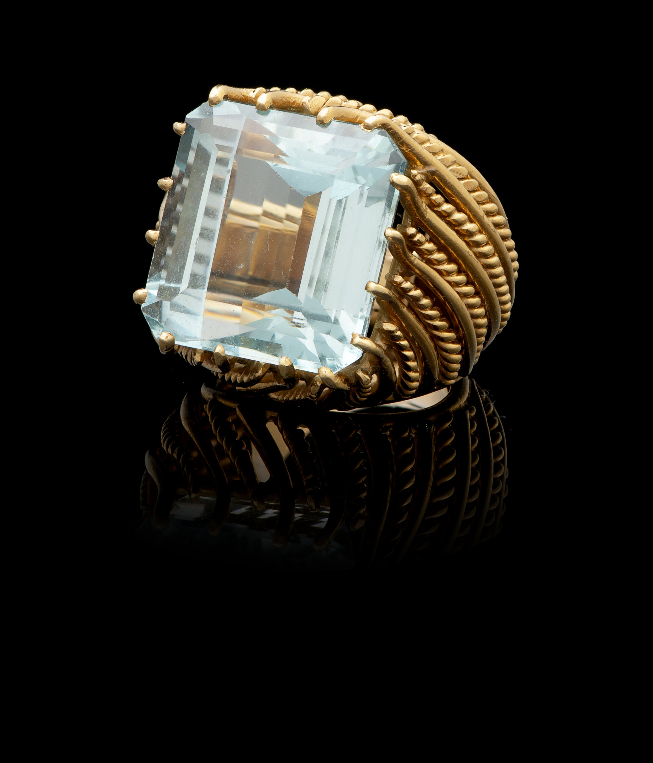 Cravejada com uma água marinha com o peso aproximado de 23,50 ct.
