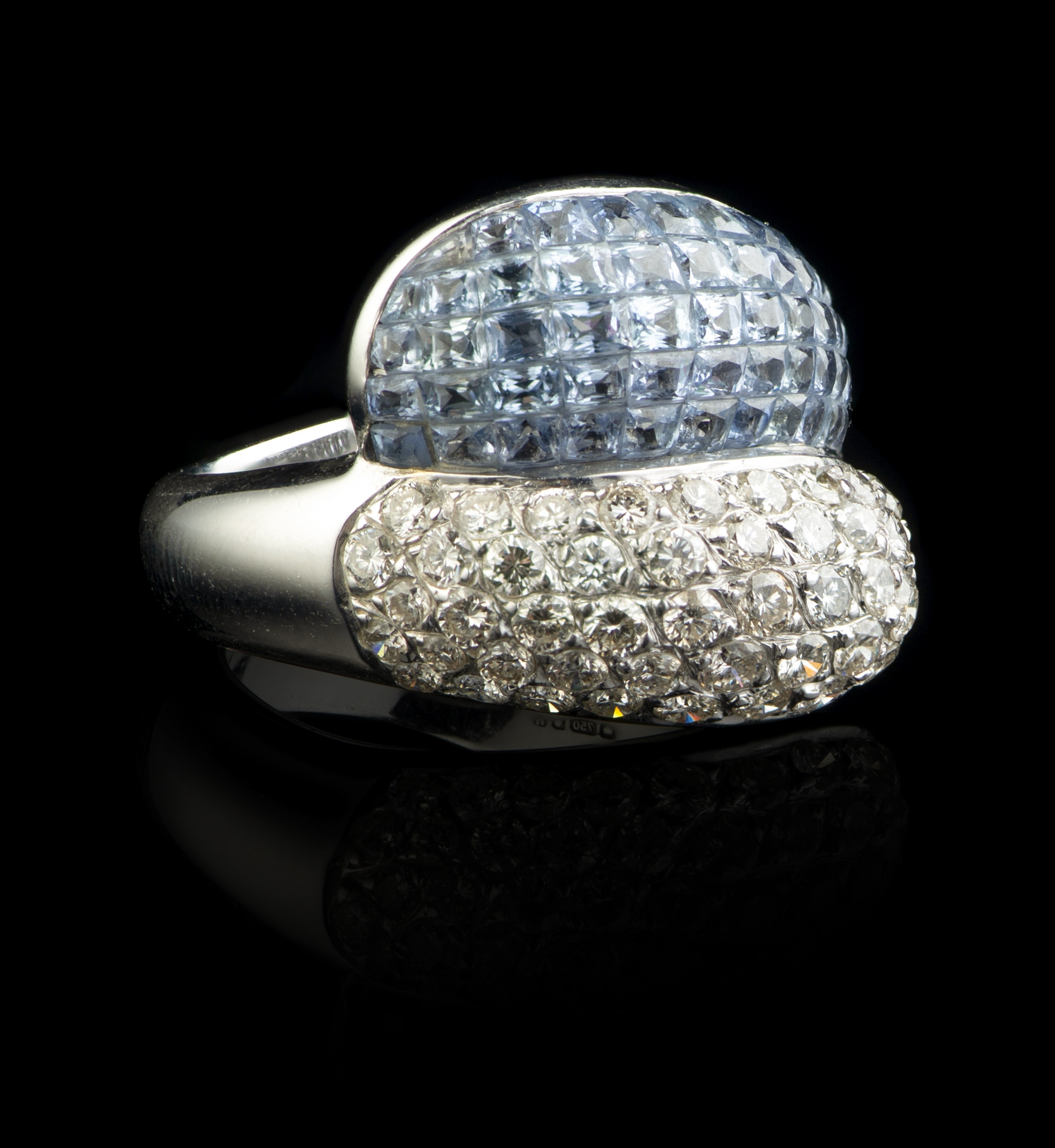 Cravejado com safiras e 48 diamantes em talhe de brilhante com o peso aproximado de 1 ct.
