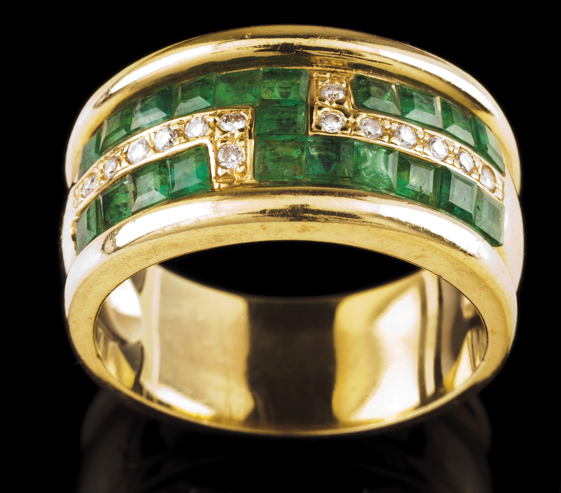 Em ouro cravejado com pequenos diamantes talhe brilhante e esmeraldas talhe quadrado