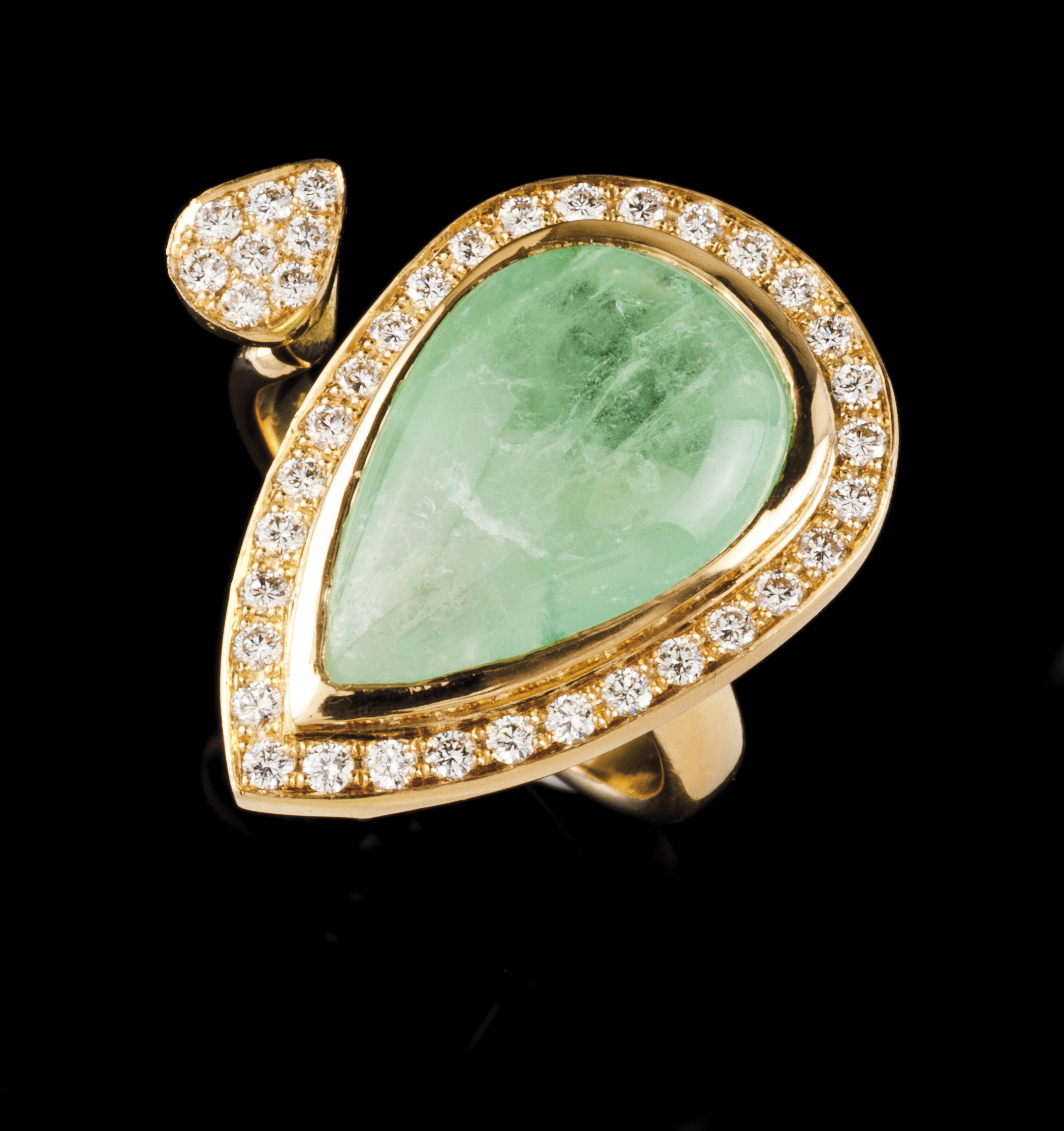 Em ouro cravejado com 39 diamantes talhe brilhante (ca. 0,40ct) e uma esmeralda em forma de gota (16,2x11,1x7,5 mm)