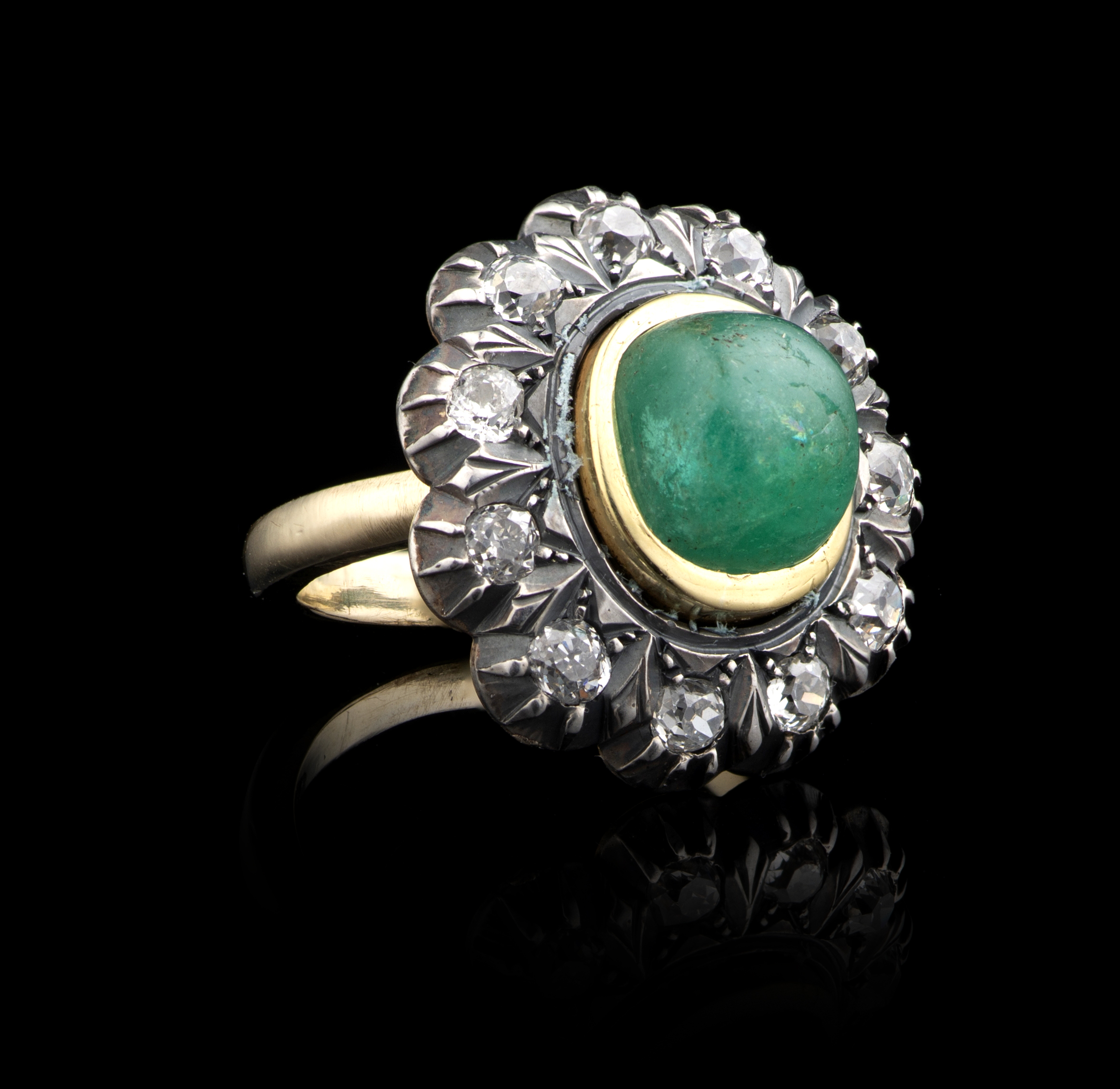 Cravejada com esmeralda em talhe cabochon e 11 diamantes em talhe antigo de brilhante com o peso aproximado de 1,10 ct.