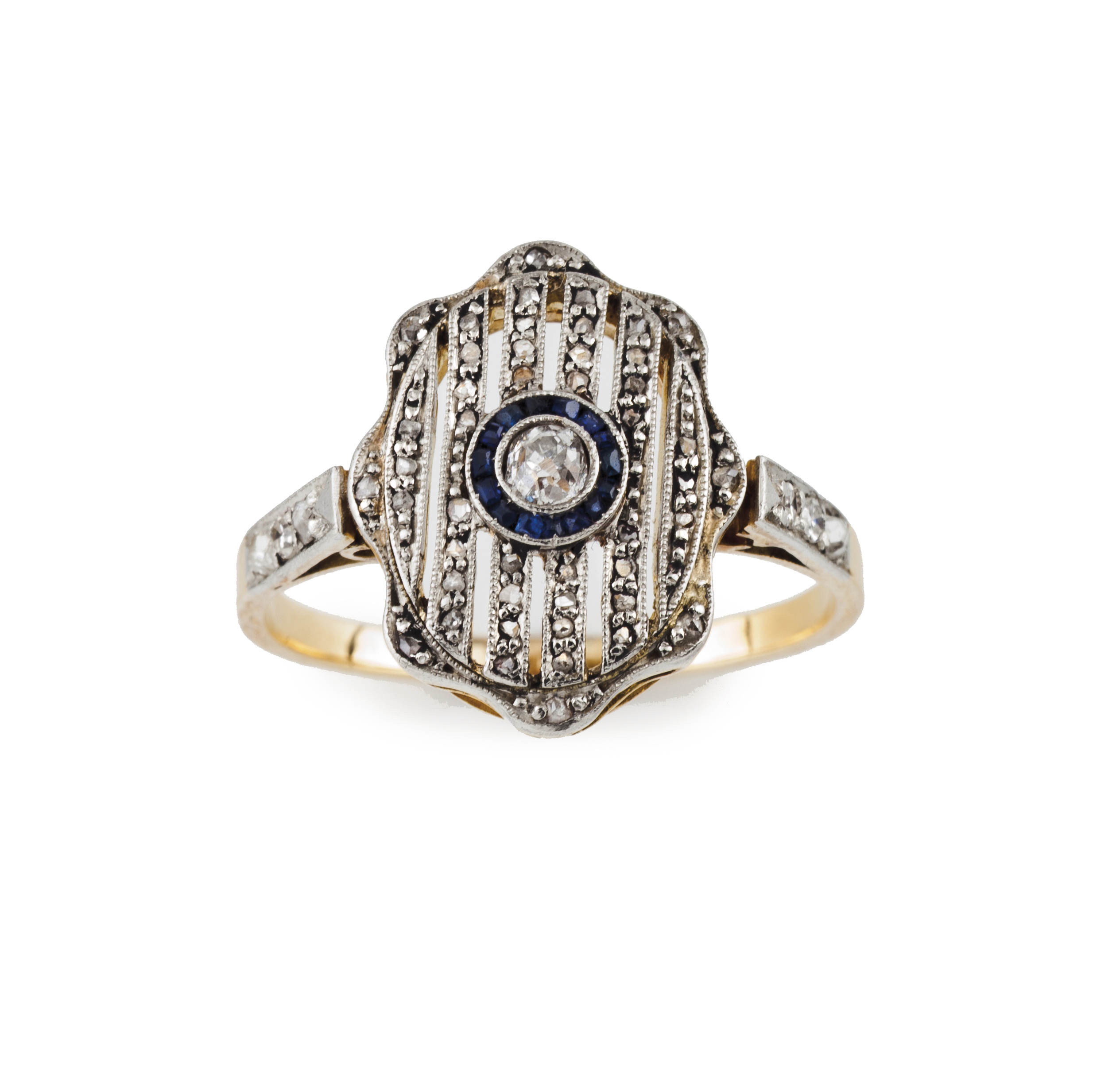 Cravejado com um diamante em talhe antigo de brilhante (ca. 0.10ct) emoldurado por safiras calibradas e frisos cravejados com pequenos diamantes em talhe rosa