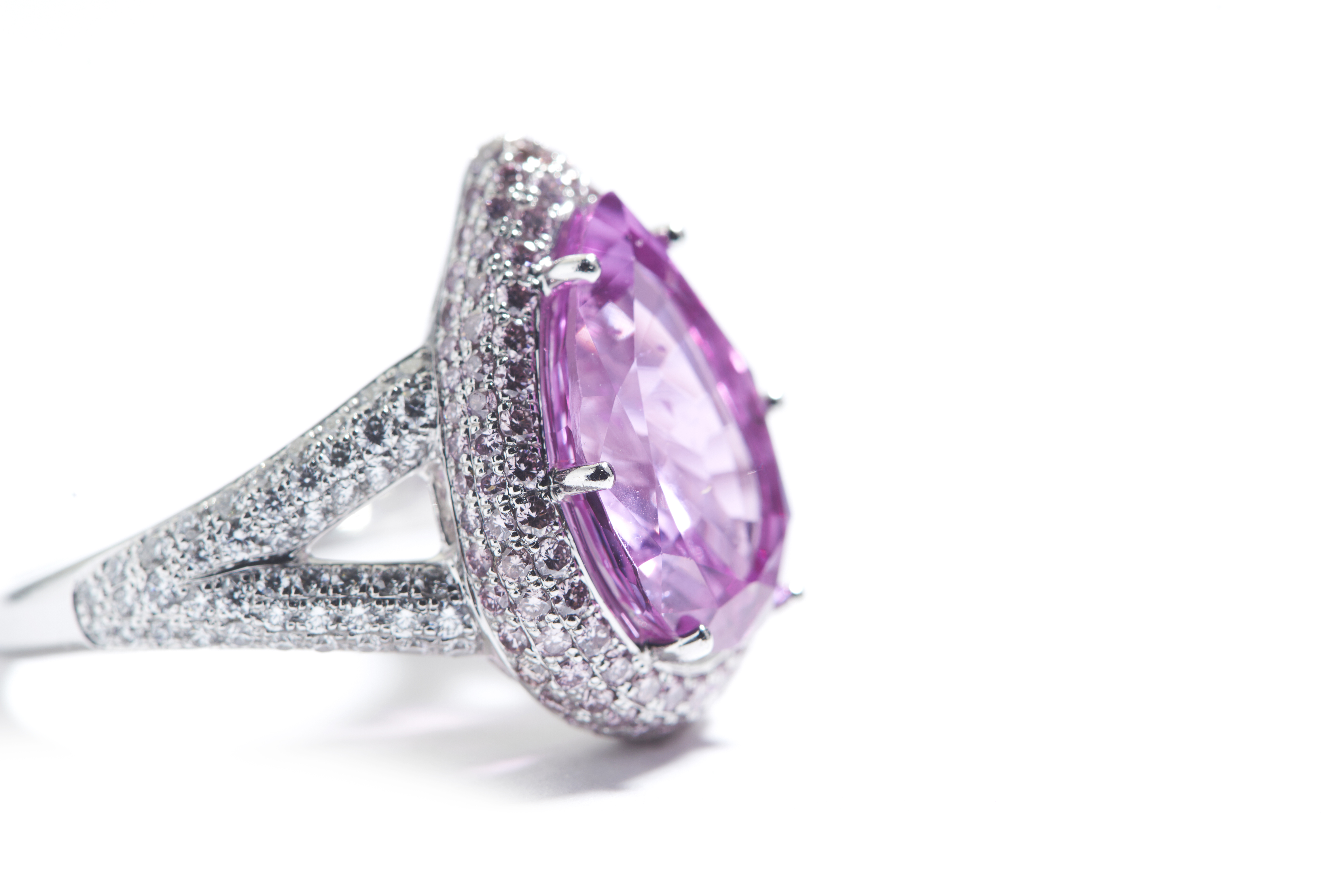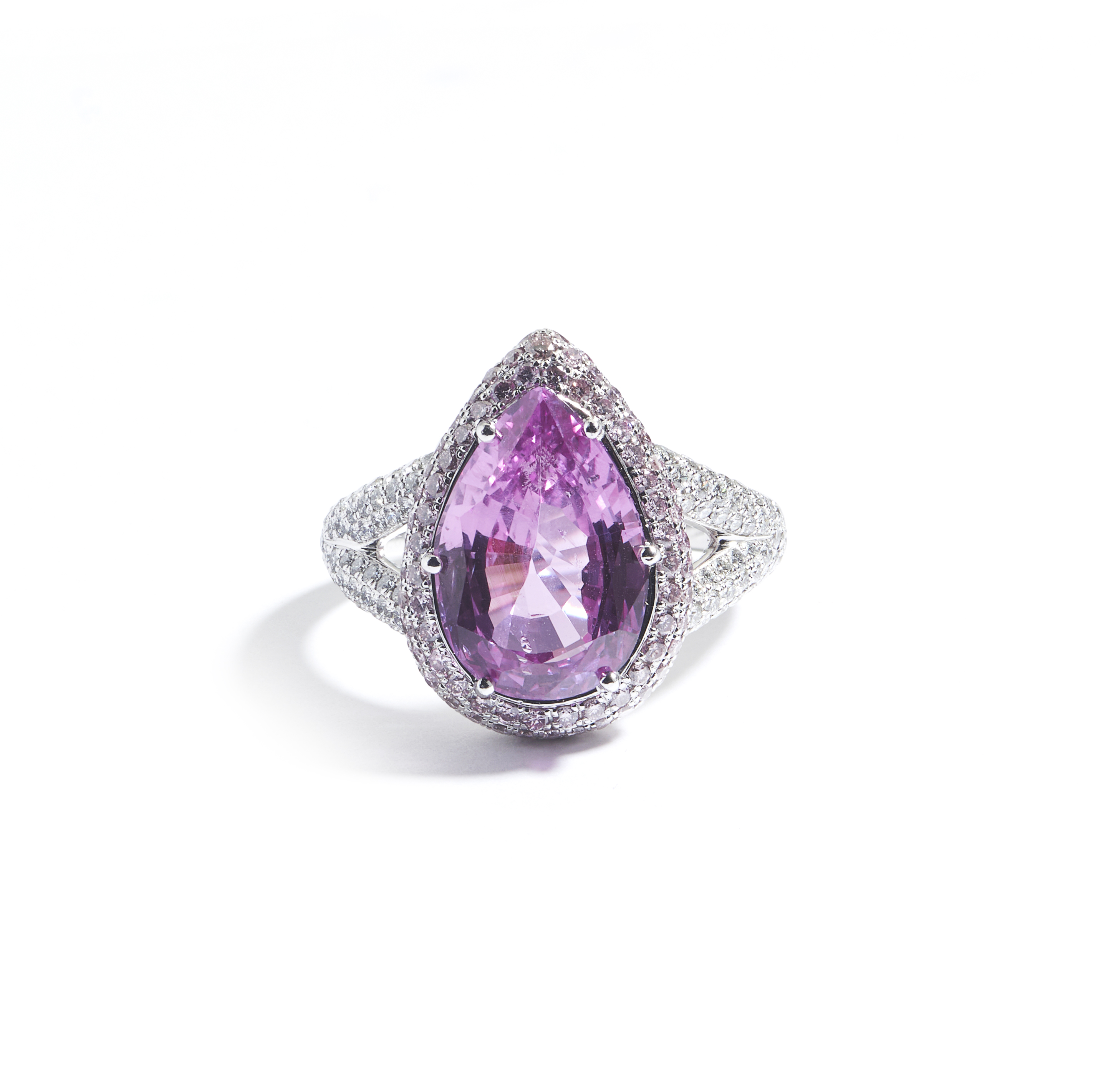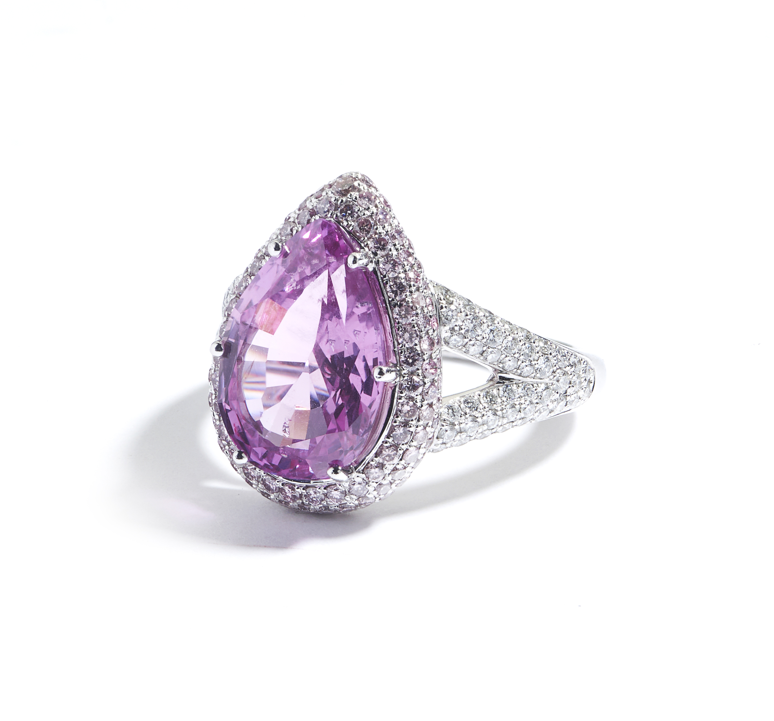 Cravejado com safira rosa em talhe gota com o peso aproximado de 7 ct., 46 diamantes incolores em talhe de brilhante com o peso aproximado de 0,46 ct. e 109 de tom fancy light pink com o peso aproximado de 1,10 ct.