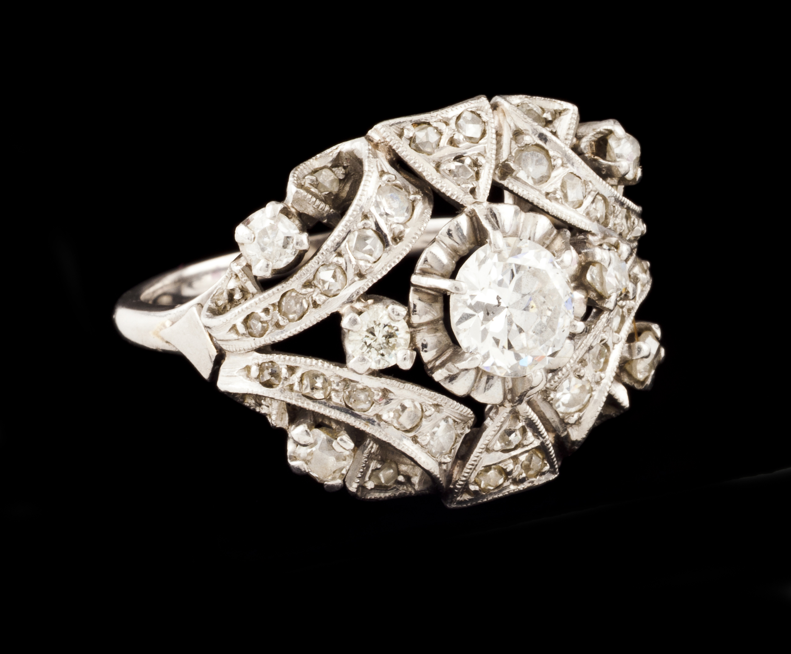 Em ouro branco cravejado com pequenos diamantes talhe rosa e talhe 8/8 e um diamantes talhe brilhante maior com aprox. 0,70ct