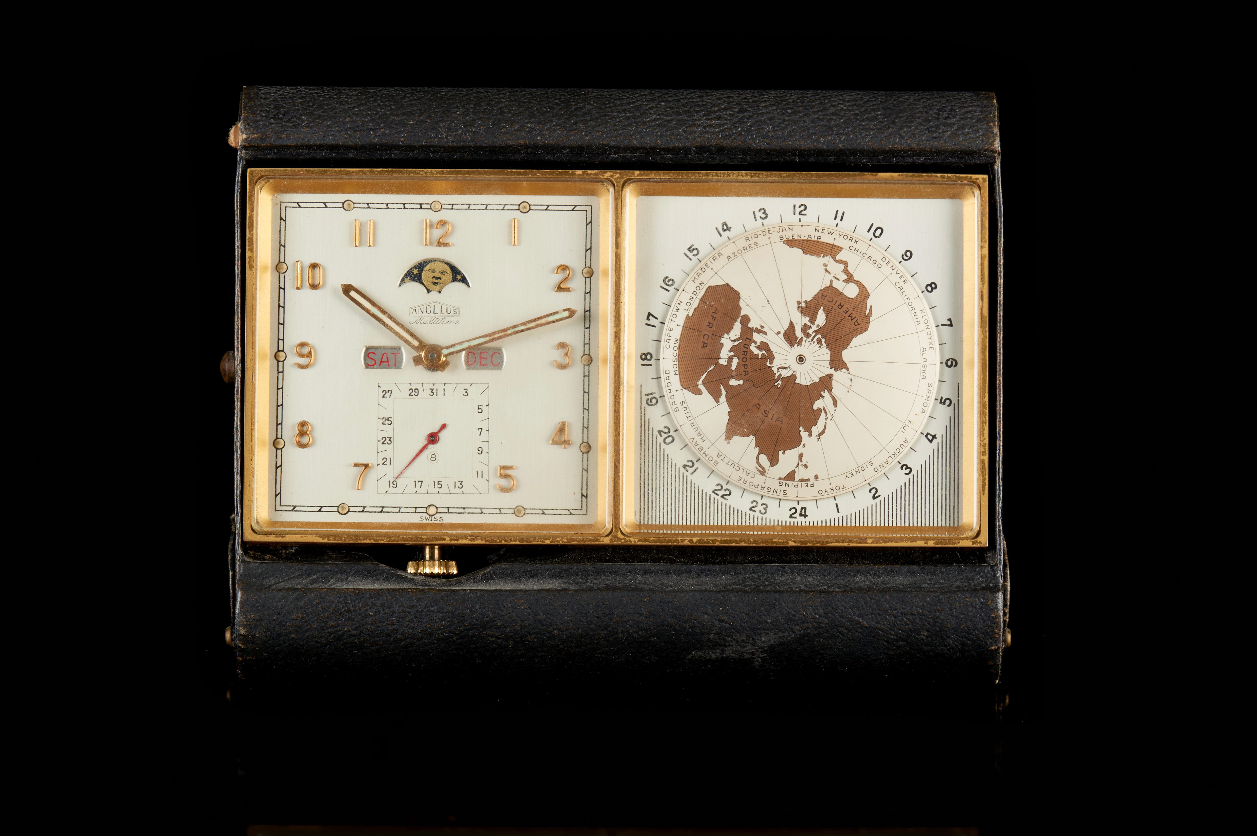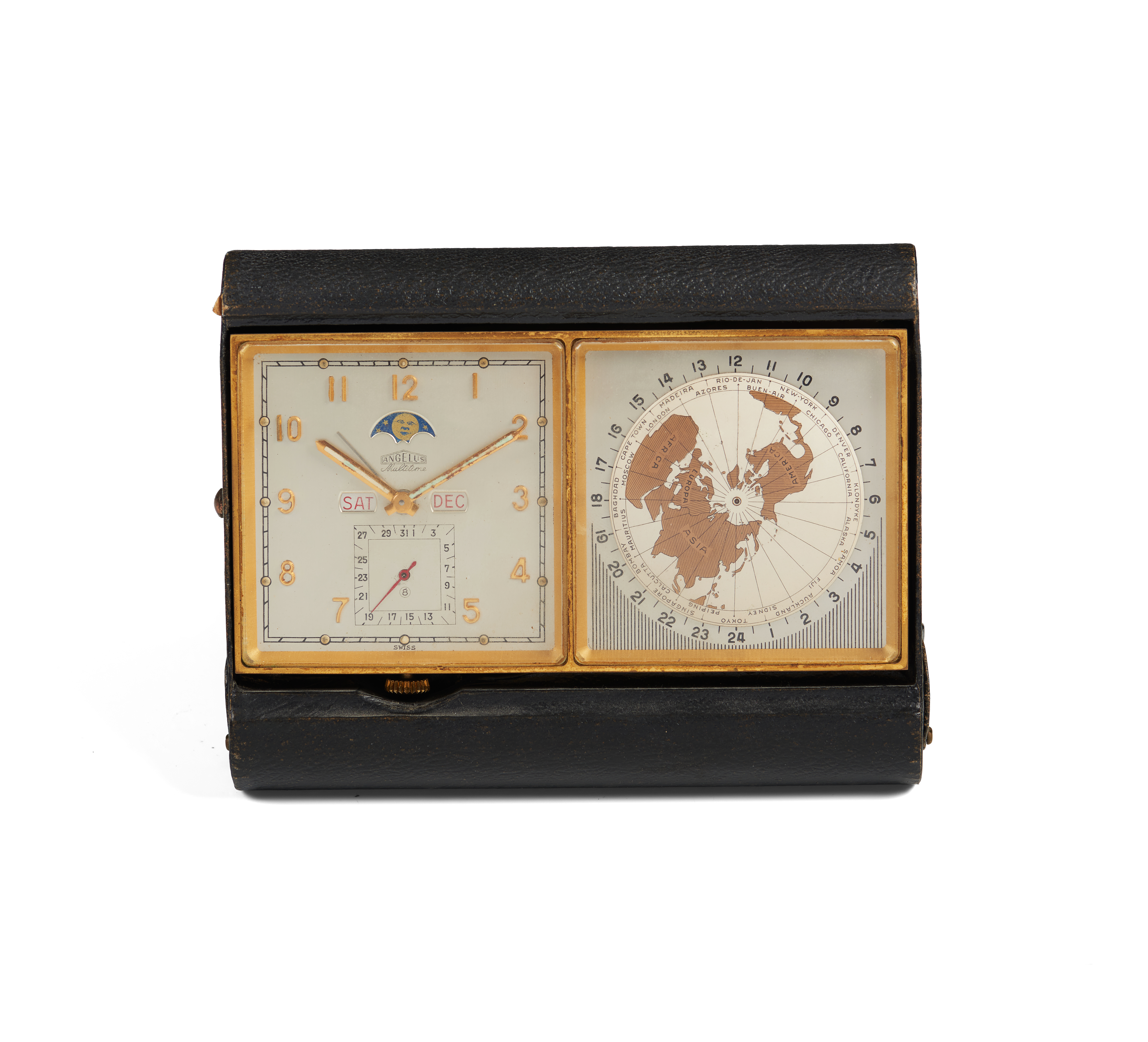 Relógio de mesa, modelo Multitime. Movimento mecânico de corda manual com função alarme, calendário triplo (mês, dia do mês e dia da semana), fases da lua e mostrador GMT. Caixa em bronze. Acompanha estojo original e manual de instruções.
