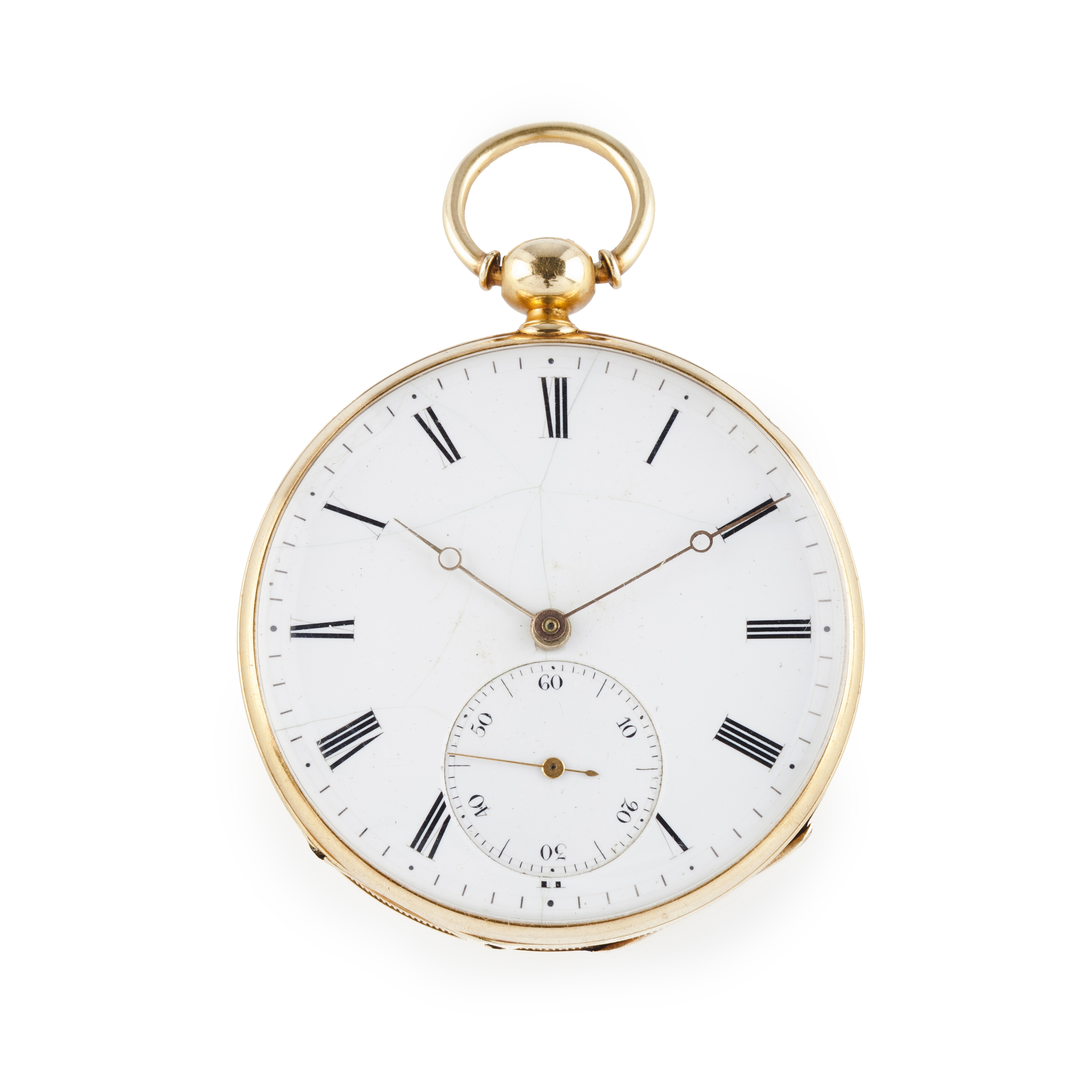 Relógio de Bolso. Movimento mecânico de corda manual com chave e com regulação. Caixa em ouro (750/000) com duas tampas. Mostrador com numeração romana. Com marcas de uso. Funcionamento por testar.