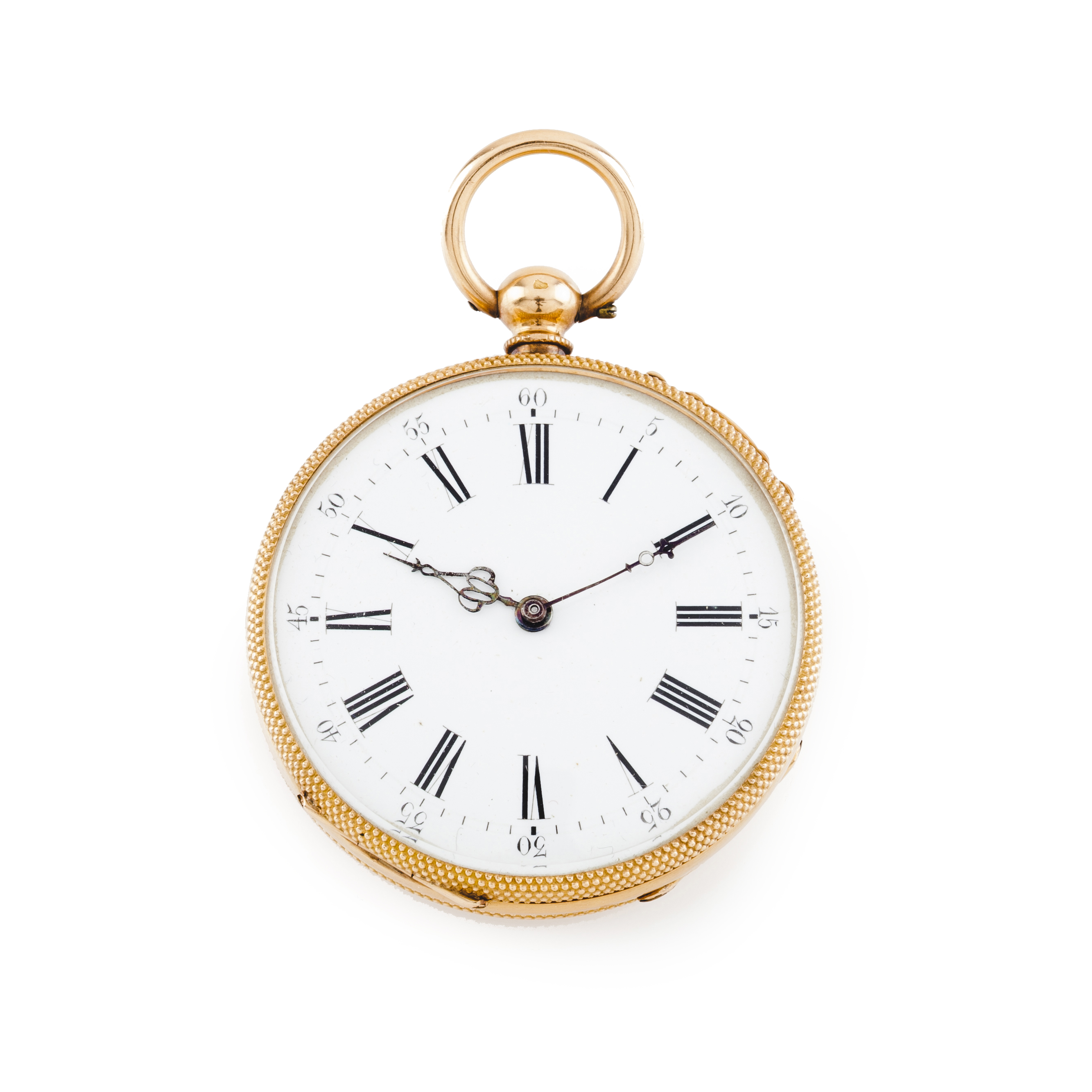 Relógio de Bolso. Movimento mecânico de corda manual com chave e com regulação. Caixa em ouro (750/000) com duas tampas. Mostrador com numeração romana. Em muito bom estado de conservação. Por testar funcionamento.