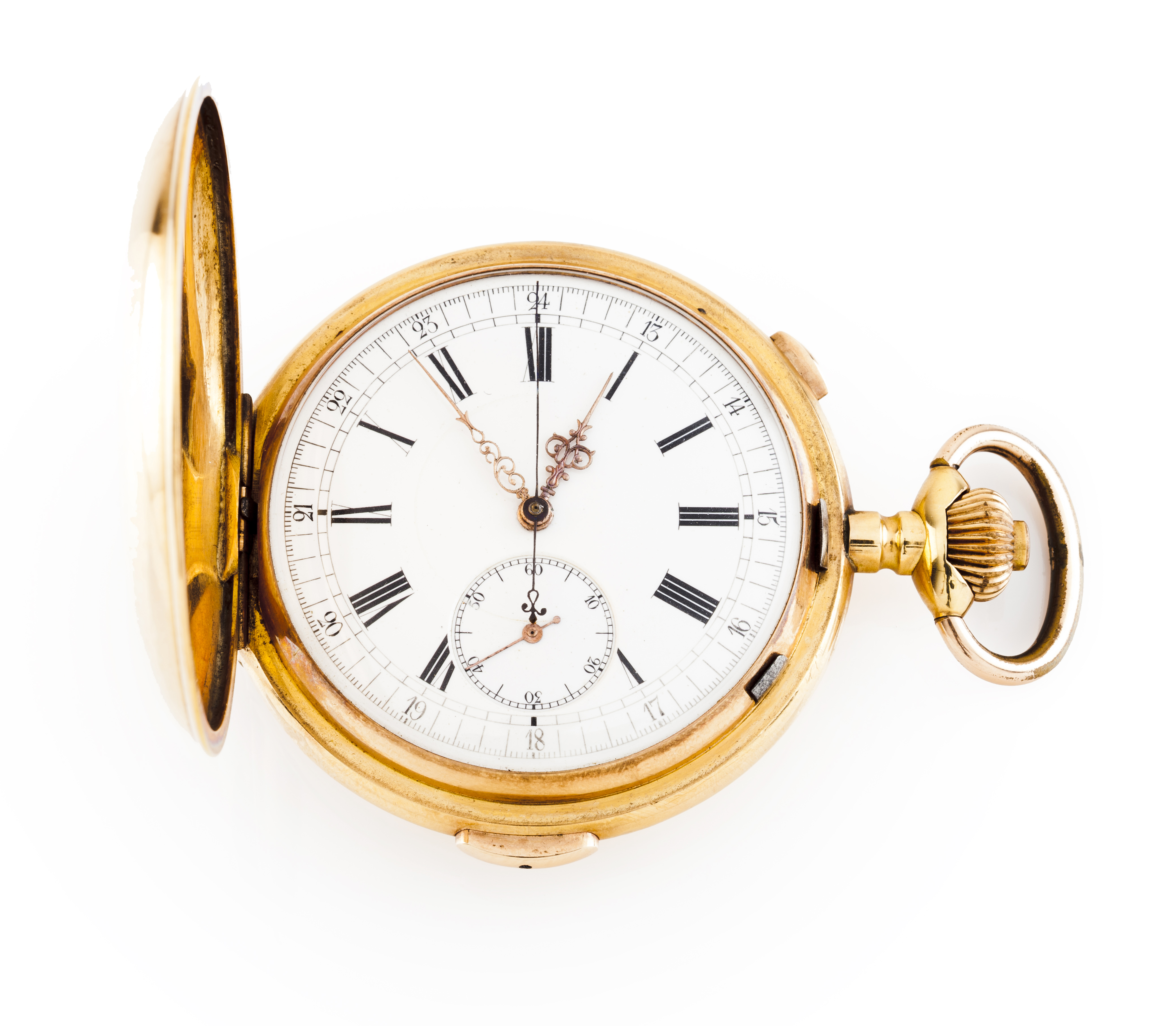 Relógio de Bolso, modelo caçador. Movimento mecânico de corda manual com regulação, função cronógrafo e repetição de horas e de quartos. Caixa em ouro (750/000) com três tampas. Mostrador com numeração romana. Em muito bom estado de conservação.