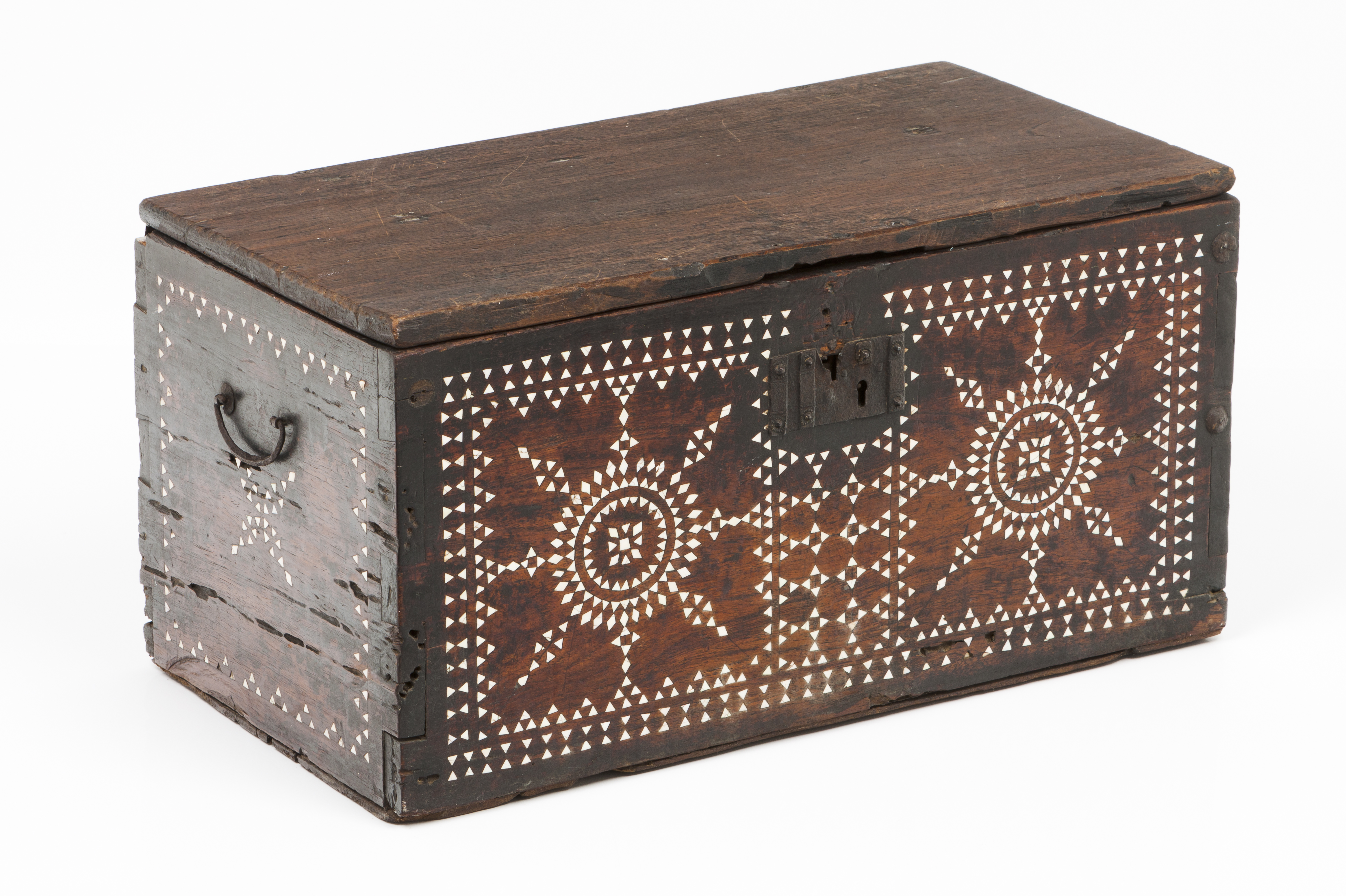 Decoração com embutidos de madrepérola, ferragens em ferro