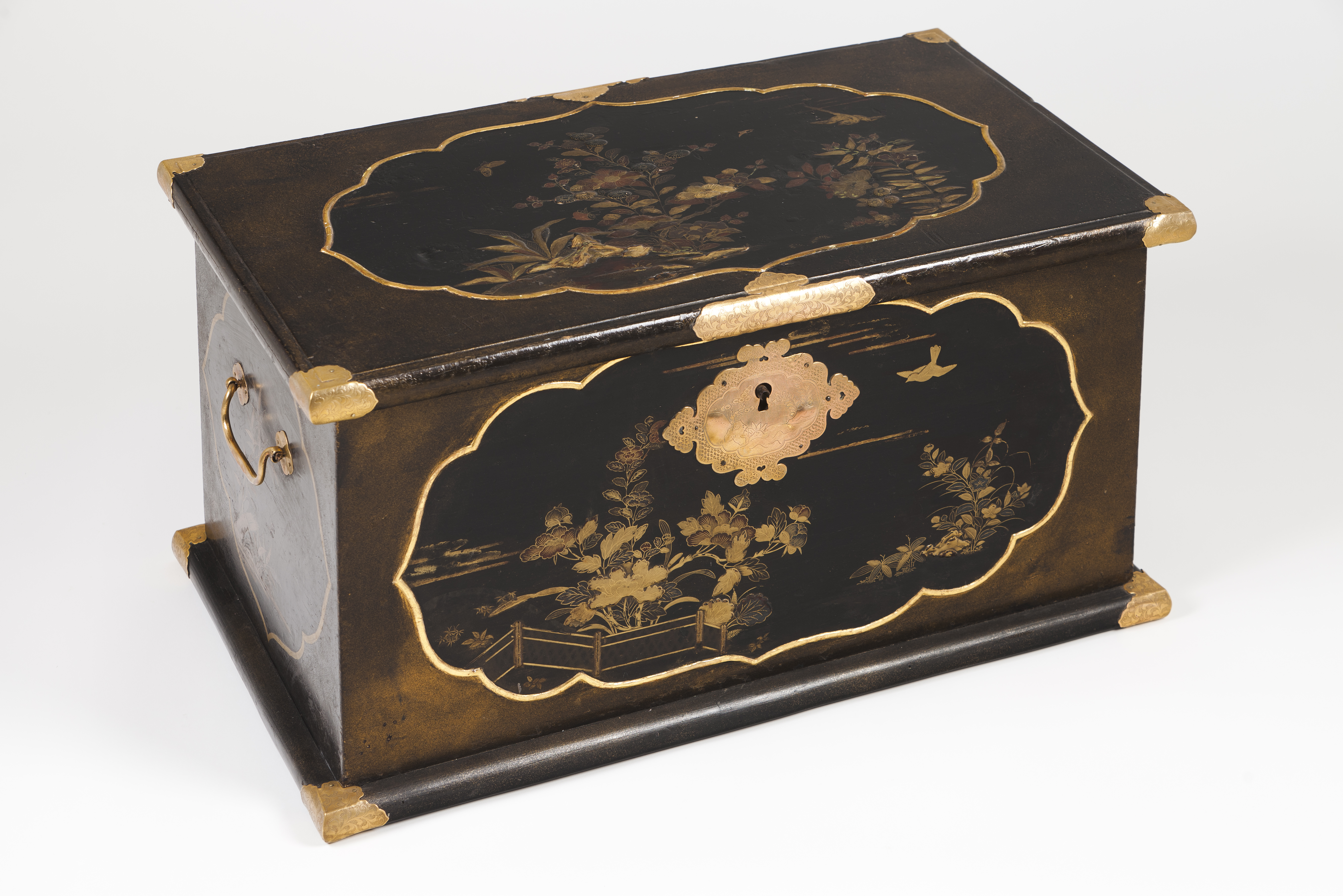 Decorada com partículas de ouro e reservas recortadas contendo representações de vistas de jardins com flores e pássaros