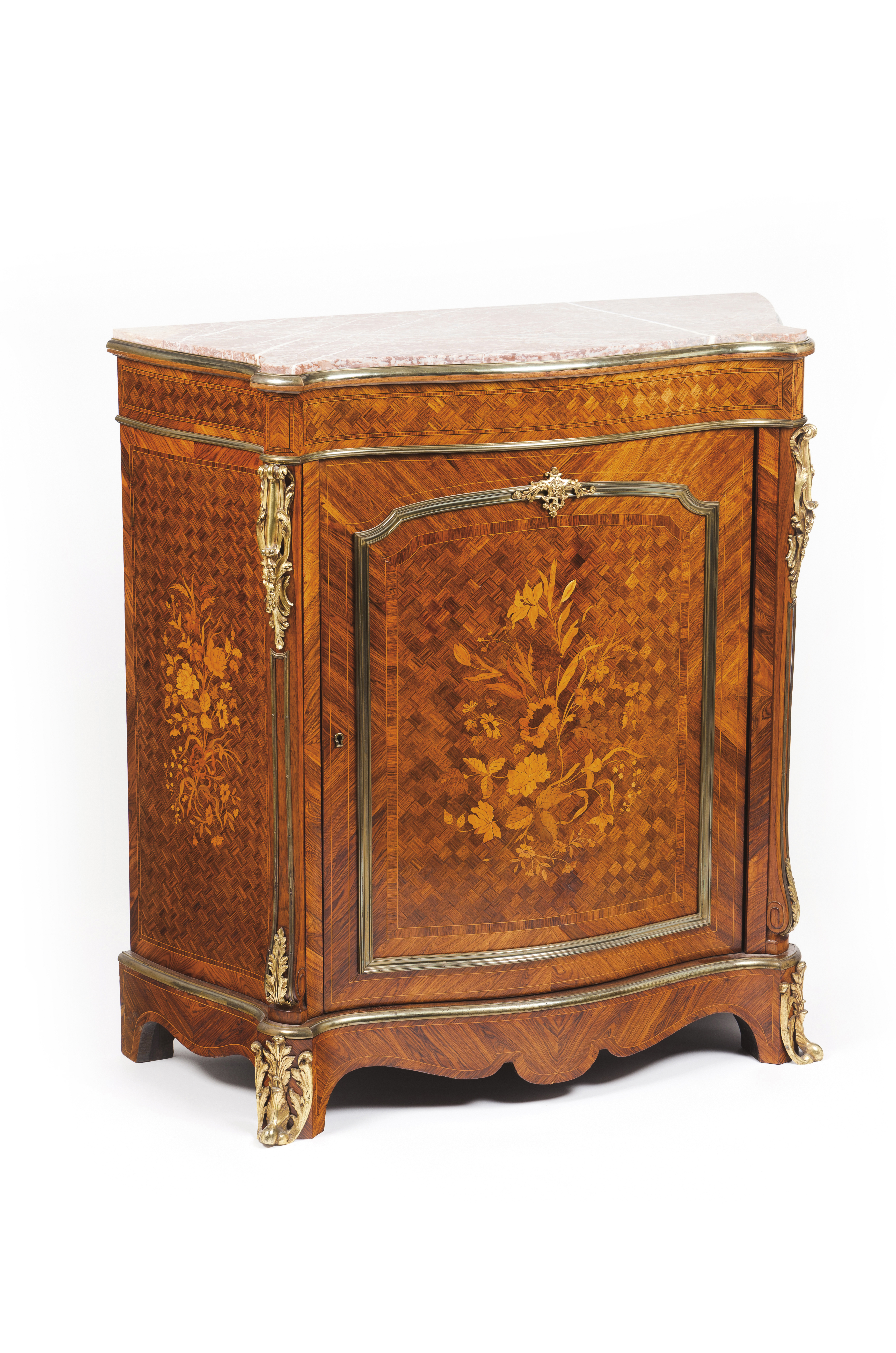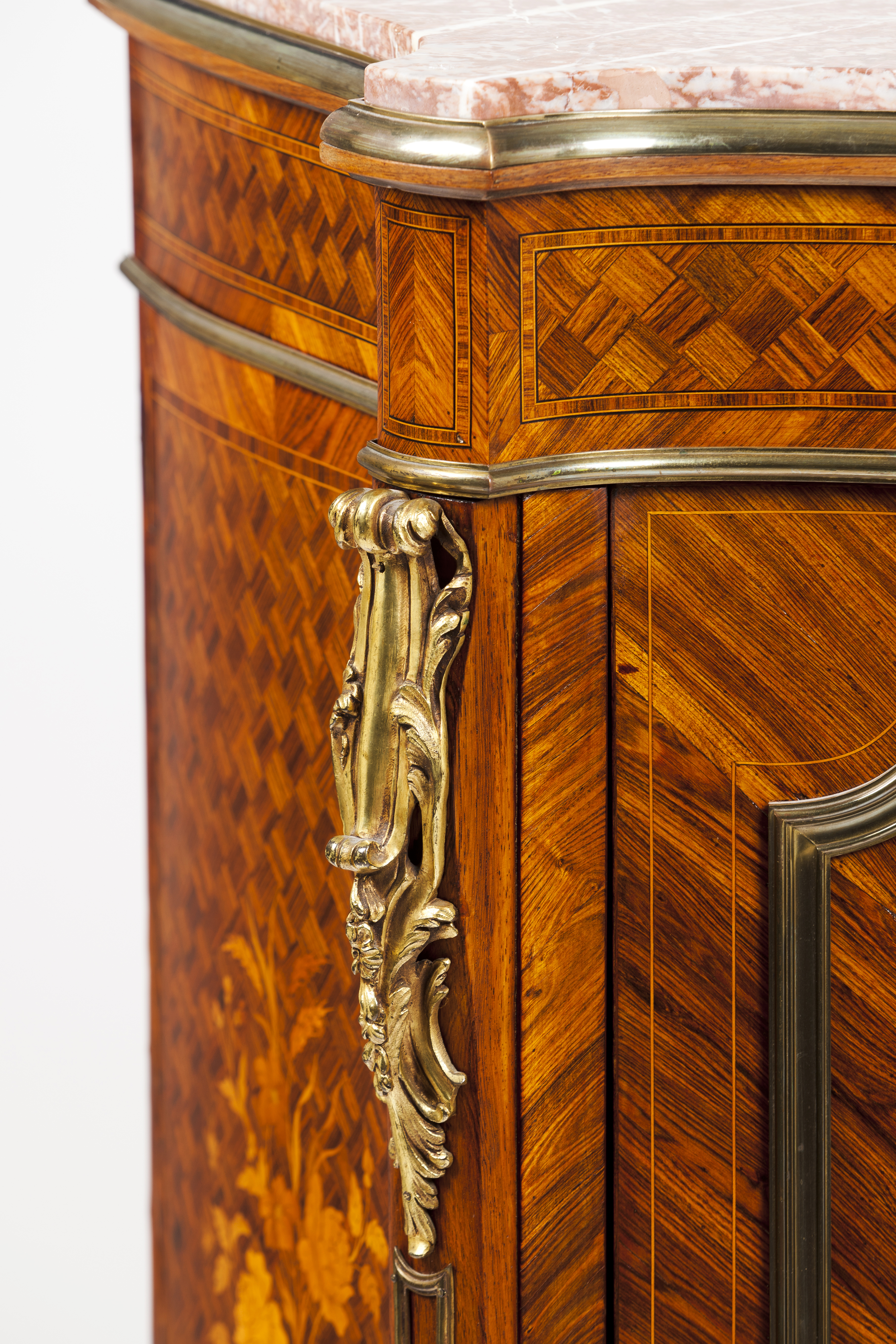 Com tampo em mármore rosa, uma porta e ferragens em bronze dourado