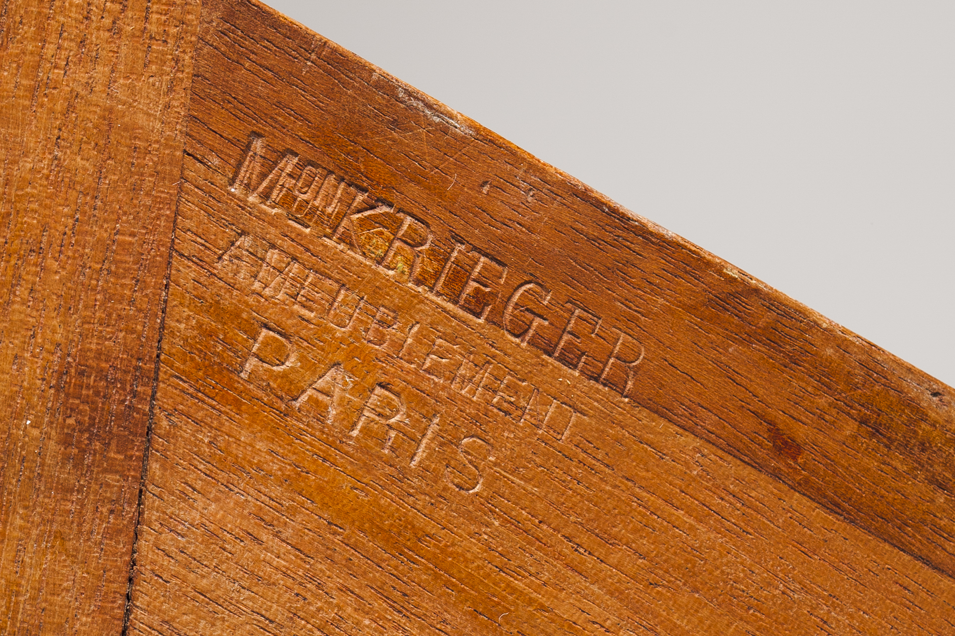 A Maison Krieger foi, para além de uma das mais conceituadas casas de mobiliário da segunda metade do século XIX, a reminiscência do trabalho do ebanista Antoine Krieger que, no ano de 1826, se estabeleceu com o irmão Nicolas Krieger em Paris, na zona de Faubourg Sainte-Antoine, mais propriamente no número 17 da Rua de SaintNicolas. Depois de várias mudanças de morada, em 1850, e já segundo a estampilha Antoine Krieger & Cie, a oficina passa a estar domiciliada no número 76 da mesma rua. Tendo participado nas grandes exposições da 2ª metade do século XIX, destaca-se a Exposição de Londres de 1851 onde obteve uma medalha de 2ºclasse e, na Exposição de Nova Iorque, em 1853, na qual apresentou um móvel com painéis entalhados onde figuravam medalhões esculpidos com a representação da caça ao veado e falcoaria da idade média. Com a morte de Antoine Krieger, em 1856, a sua oficina foi entregue aos genros Claude-Julien Cosse e Henry Racault que continuaram o seu trabalho e linha artística, apesar de a casa funcionar como uma cooperativa, com o nome e respetiva estampilha alteradas para CosseRacault et Cie. (Ledoux-Lebard 1984, 390). Quatro anos depois surge uma nova alteração no nome da casa e nas referidas estampilhas que recuperam o nome do seu fundador, passando a designar-se A. Krieger et Cie ou A. Racault et Cie. Já partir de 1880 temos as estampilhas apensas no mobiliário Damon et Cie e também as estampilhas “M(ais)on Krieger Ameublement Paris” (Ledoux-Lebard 1984). Nas peças produzidas na primeira década de 1900 encontramos a estampilha DUVIVIER PARIS 77 FG-ST ANTOINE associada à Maison Krieger. Isto evidencia que a mesma continuou a produzir ainda nos inícios do século XX, encontrando-se sediada no número 77 da rua Faubourg-Saint-Antoine, em Paris. Sendo uma das maiores e melhores lojas/casas de mobiliário da Paris oitocentista, esta exibia e criava peças nos mais variados estilos. Aí se encontravam copias do século anterior, como interpretações das épocas Luís XV e XVI. Contemporaneamente, desenvolve-se uma criatividade artística própria do século, baseada num hibridismo das artes do passado, denominado estilo Napoleão III sendo este móvel um exemplo claro. Com produção realizada até aos inícios da década de 1920, o trabalho da Maison Krieger figurou na Exposição Universal de 1900, onde François Linke (1855-1946) atingiu o sucesso – servindo de exemplo o móvel de aparato (Inv. FMA9) que a Casa-Museu Medeiros e Almeida apresenta no seu acervo.