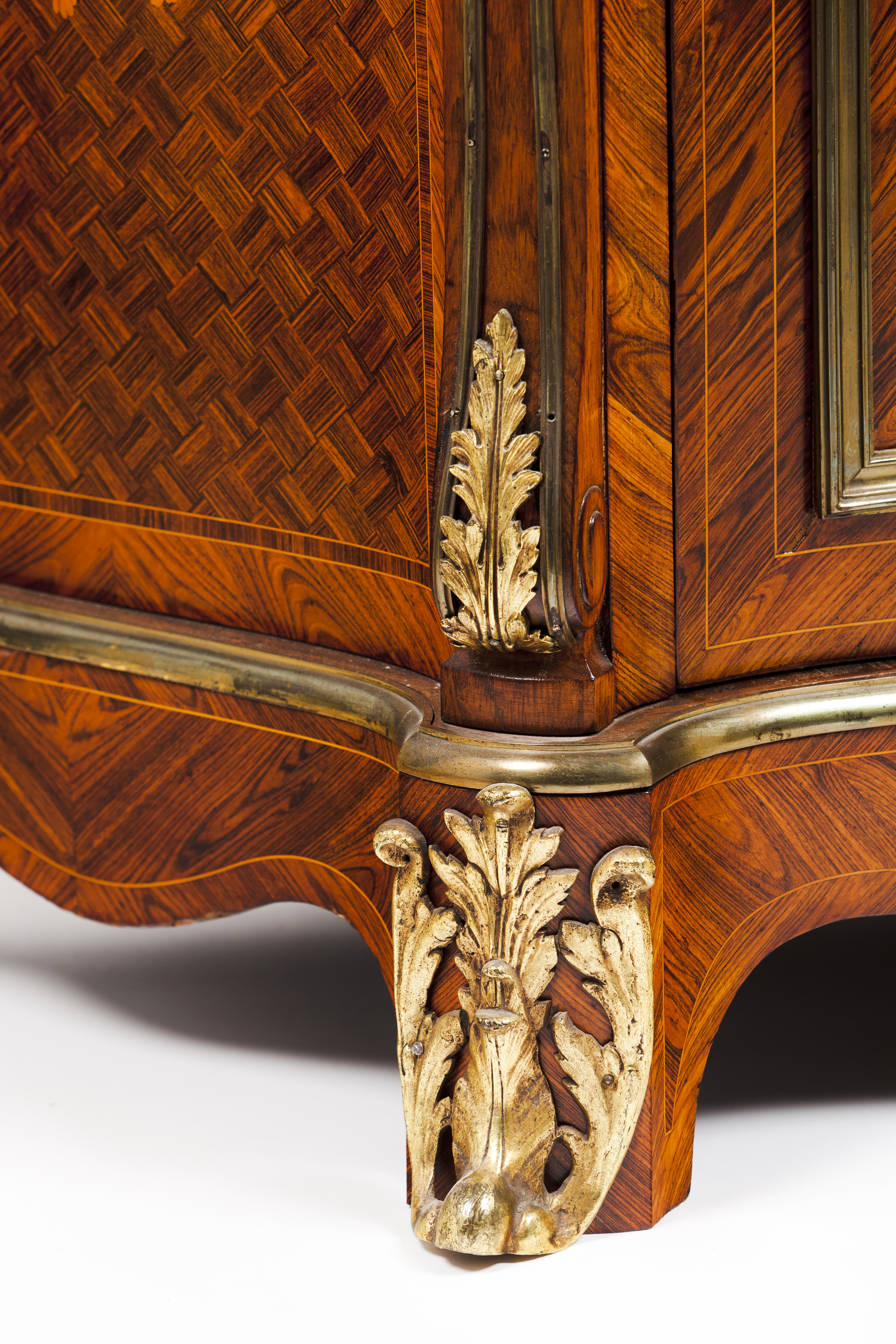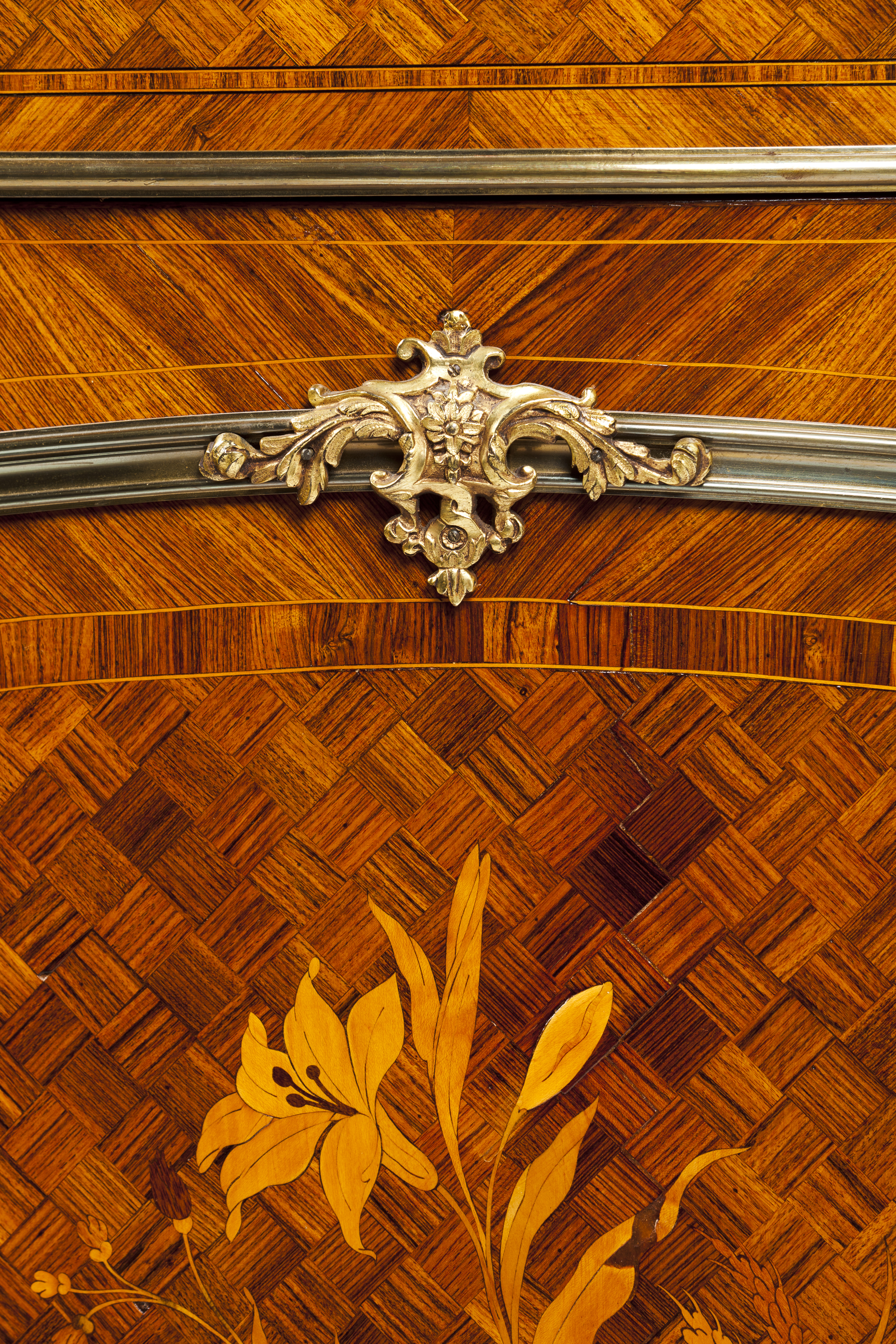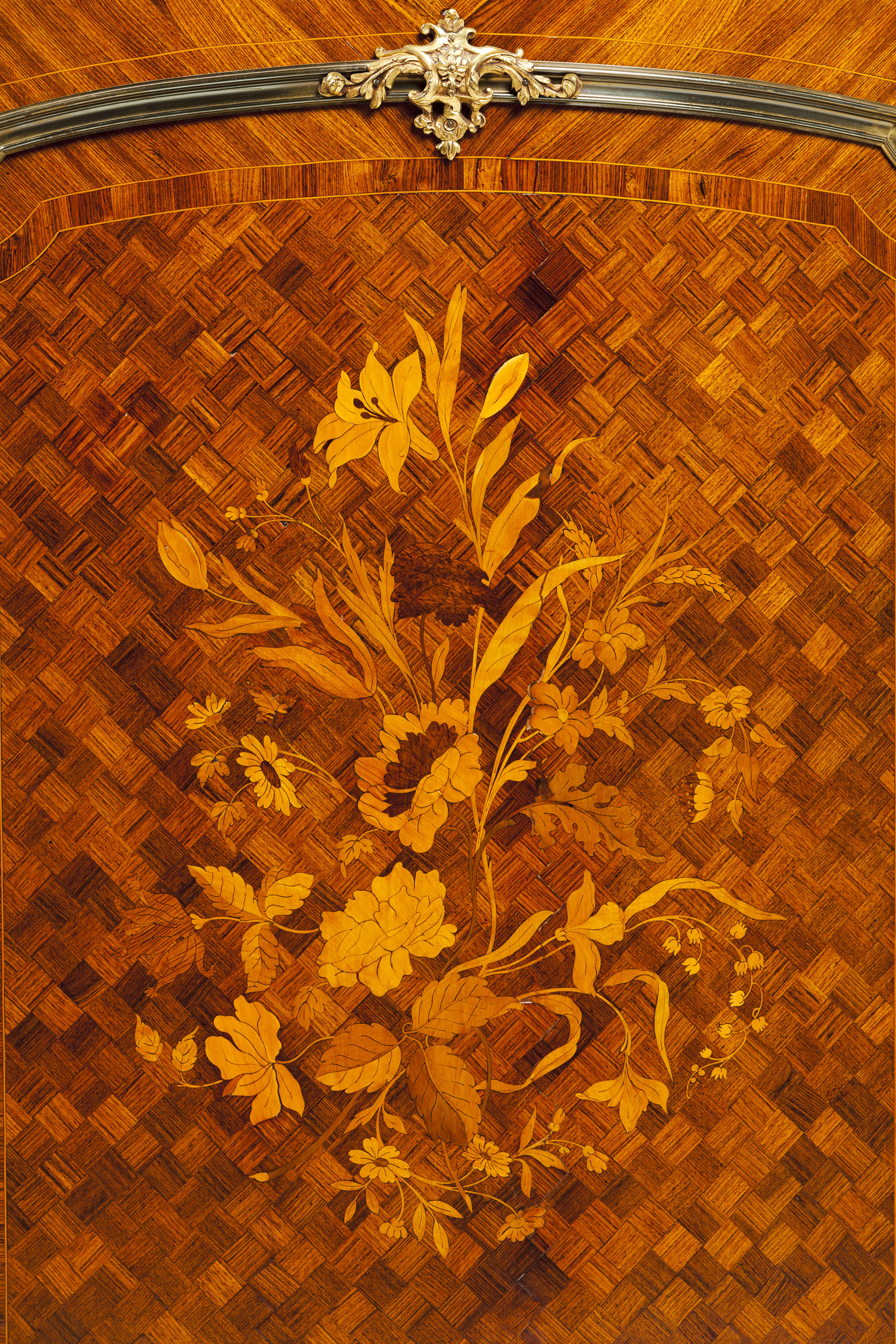 Decorado com rico trabalho de marchetaria representando arranjos florais na frente e laterais