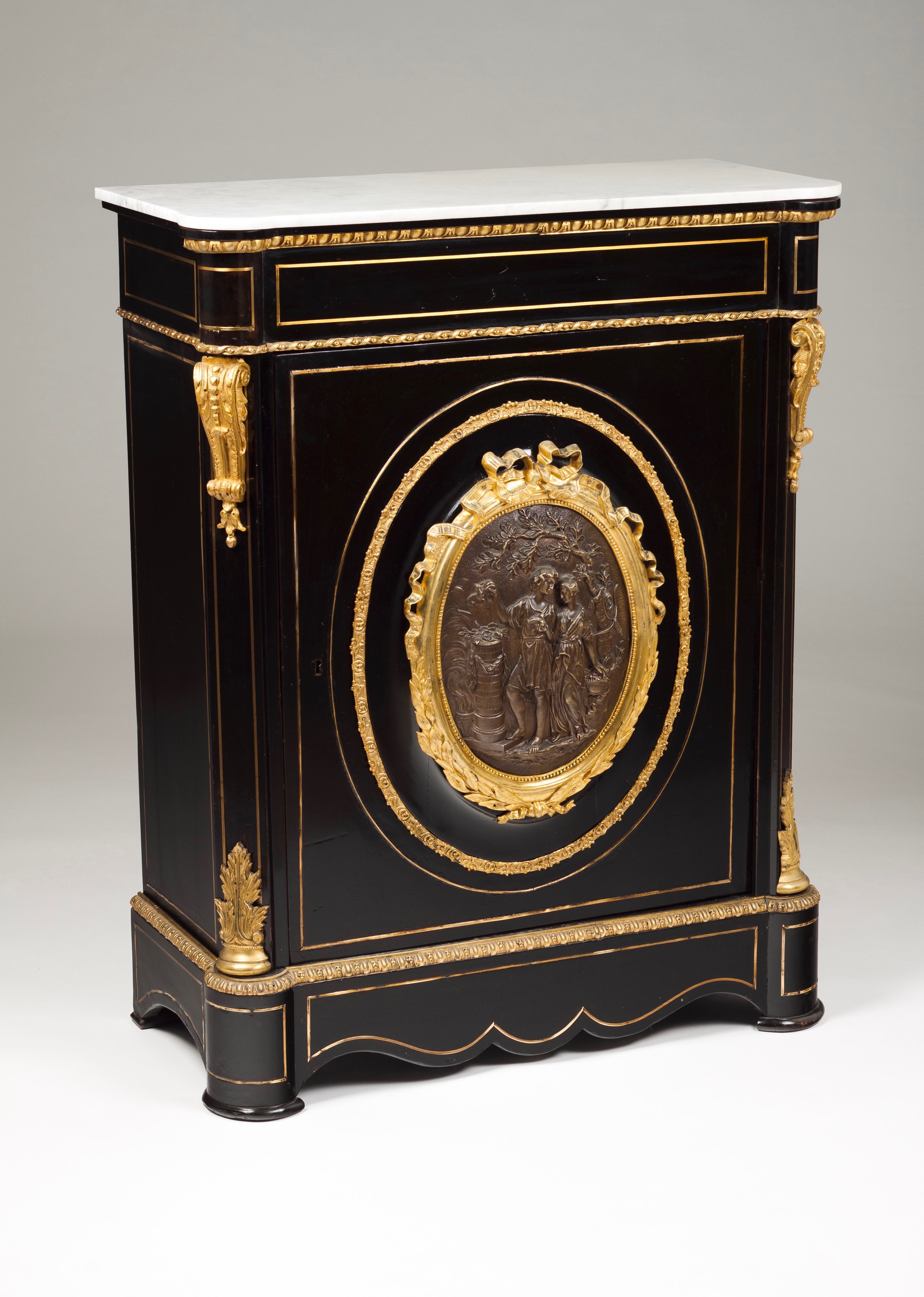 Aplicações em metal dourado relevado ao centro com placa em bronze representando cena de jardim com figuras, árvores e pássaros