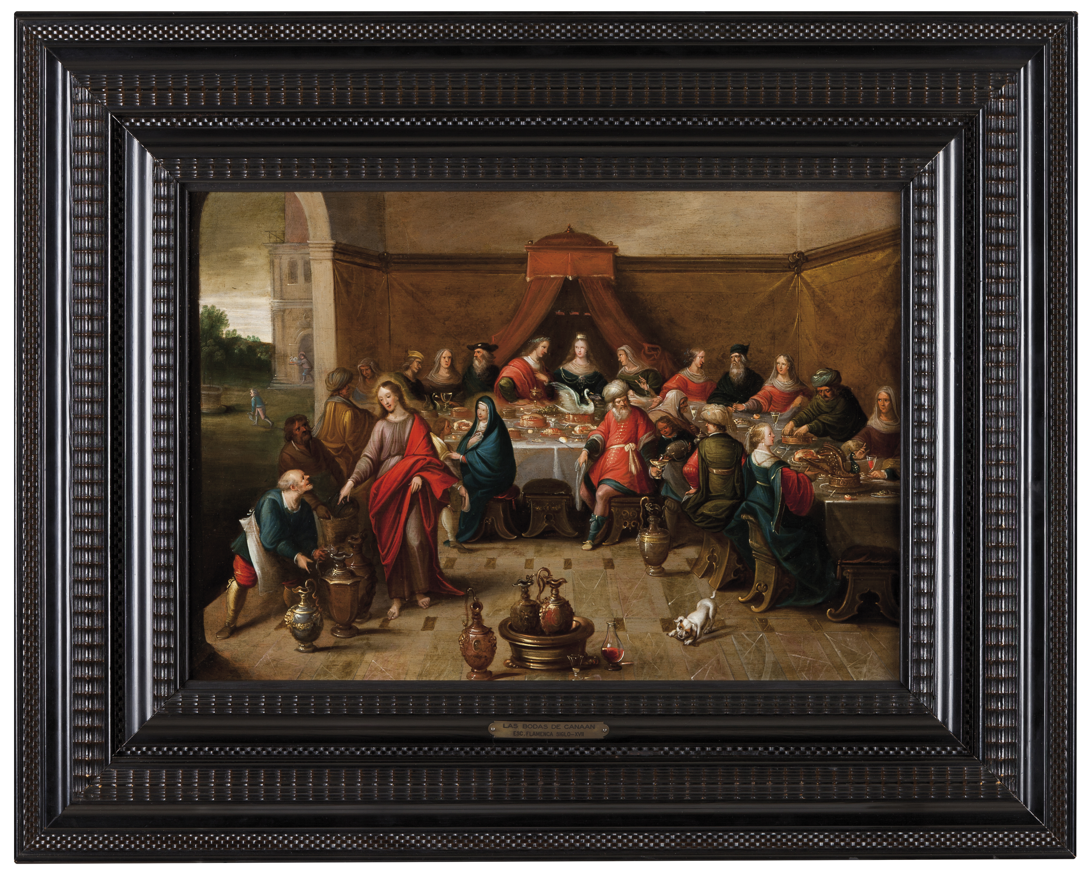 Esta pintura mostra-nos o episódio em que Jesus realiza o primeiro milagre da sua vida pública quando foram convidados para a celebração de um casamento em Canã e transformou a água em vinho. Aqui o episódio é representado como uma cena de interior onde o artista exercita a sua mestria na representação de jarrões, loiças, vestes, mobiliário e diversas iguarias. O espaço retrata um ambiente festivo, com paredes revestidas com um reposteiro (ou guadamecil) e ao centro surge um baldaquino, sob o qual estão os noivos que partilham com os seus convidados um sumptuoso banquete, repleto de extravagantes tartes decoradas com cisnes e pavões, ao gosto do séc. XVI. Em primeiro plano, à esquerda surge Jesus de pé que se dirige a um servo. Atrás de si, e a observar a cena discretamente, encontra-se a Virgem Maria sentada e envolta no seu manto azul. No canto oposto da mesa está o mestre-sala que é servido por um jovem criado, que lhe serve o vinho milagroso para degustação. Para além dos detalhes que já mencionamos, destaca-se a representação de um pequeno cão que surge a roer um osso junto a uns jarrões de vinho, decorados com enorme detalhe. Em último plano, temos uma vista para o exterior onde é representado um jardim com um poço ao qual se dirige um criado para ir buscar água, enquanto outro sai de outra sala da casa com uma travessa decorada com um cisne. A temática das “Bodas de Canã” parece ter conquistado grande popularidade por parte da clientela burguesa e eclesiástica da época, confirmando-se a produção de várias pinturas com grandes afinidades entre si, essencialmente sob o ponto de vista da composição. A pintura que mais se assemelha com esta parece ser o óleo sobre madeira que foi leiloado na Christie’s de Londres. Destacam-se outras versões idênticas nomeadamente uma na colecção do Hermitage e outra na Yale University Art Gallery.